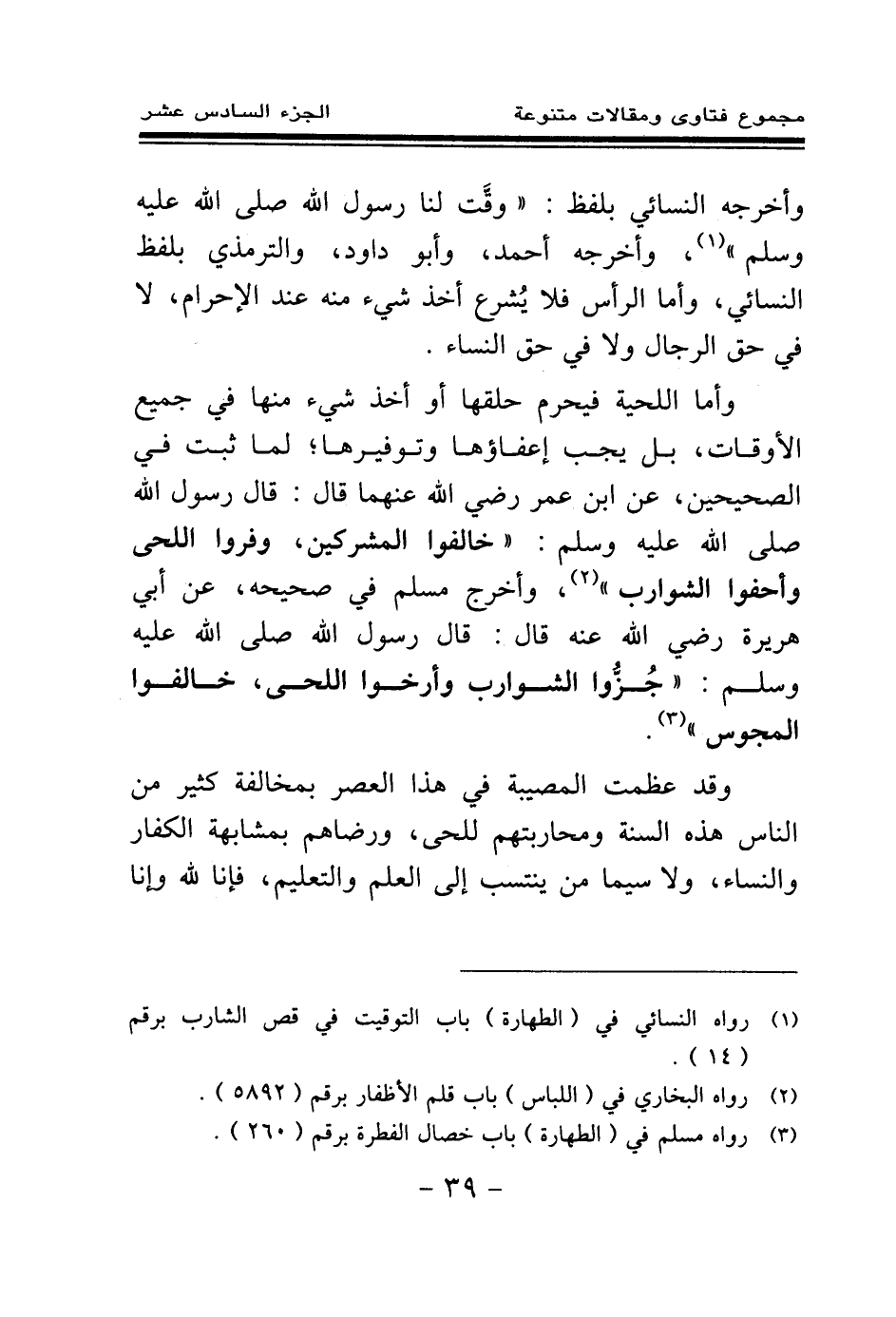 وقد عظمت المصيبة في هذا العصر بمخالفة كثير من الناس هذه السنة ومحاربتهم للحى، ورضاهم بمشابهة الكفار والنساء، ولا سيما من ينتسب إلى العلم والتعليم، فإنا لله وإنا