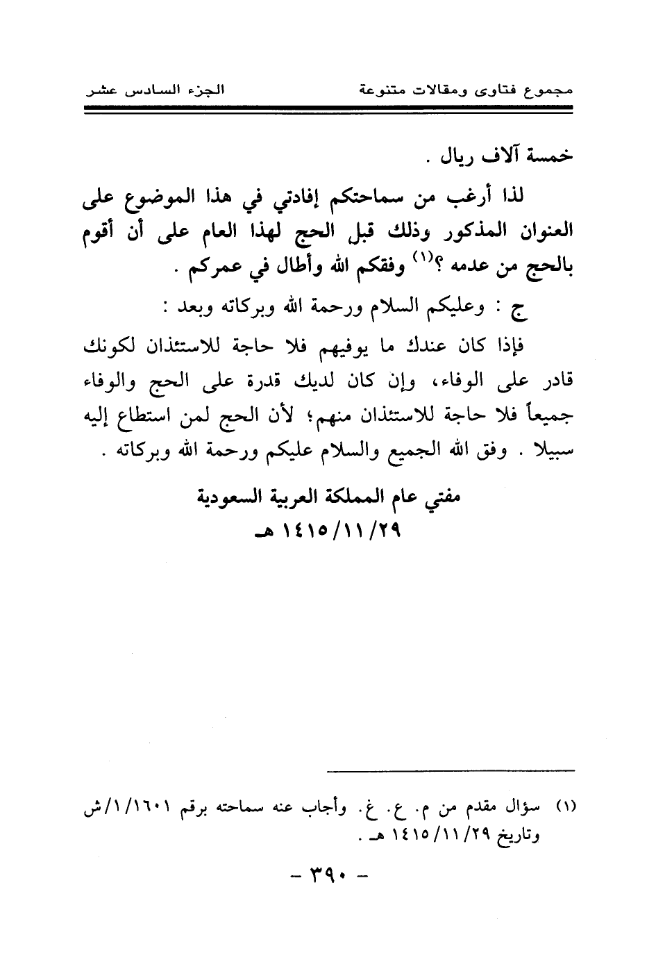 (¬1) سؤال مقدم من م. ع. غ. وأجاب عنه سماحته برقم 1601 \ 1 \ ش وتاريخ 29 \ 11 \ 1415هـ