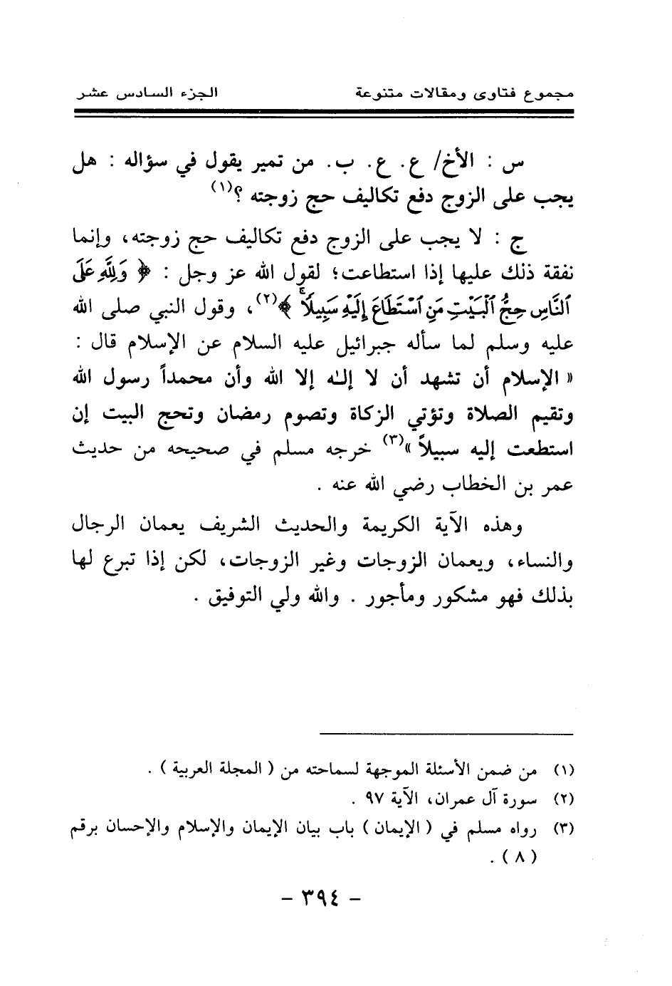 س: الأخ \ ع. ع. ب. من تمير يقول في سؤاله: هل يجب على الزوج دفع تكاليف حج زوجته؟ (¬1) .
