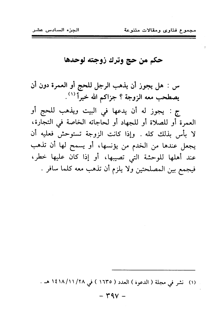 ج: يجوز له أن يدعها في البيت ويذهب للحج أو العمرة أو للصلاة أو للجهاد أو لحاجاته الخاصة في التجارة، لا بأس بذلك كله. وإذا كانت الزوجة تستوحش فعليه أن يجعل عندها من الخدم من يؤنسها، أو يسمح لها أن تذهب عند أهلها للوحشة التي تصيبها، أو إذا كان عليها خطر، فيجمع بين المصلحتين ولا يلزم أن تذهب معه كلما سافر.