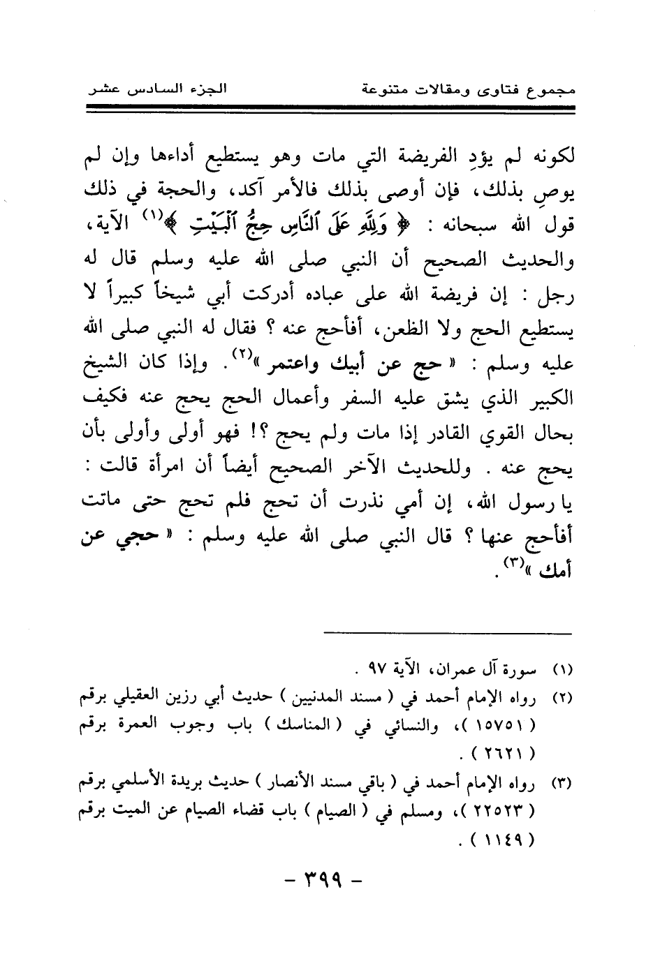 (¬2) رواه الإمام أحمد في (مسند المدنيين) حديث أبي رزين العقيلي برقم (15751) ، والنسائي في (المناسك) باب وجوب العمرة برقم (2621) .