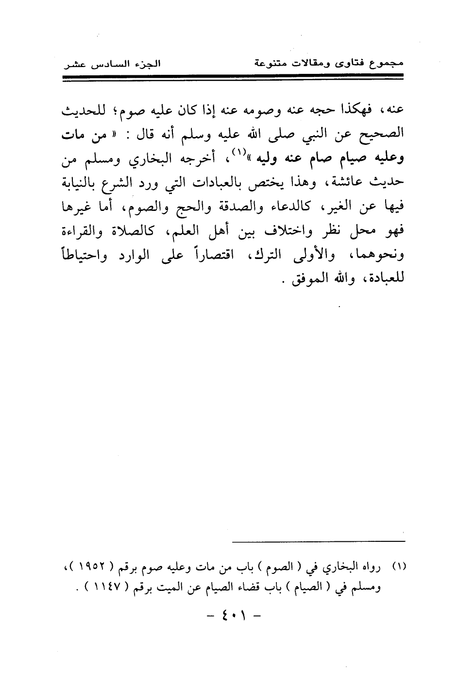 عنه، فهكذا حجه عنه وصومه عنه إذا كان عليه صوم؛ للحديث الصحيح عن النبي - صلى الله عليه وسلم - أنه قال: «من مات وعليه صيام صام عنه وليه (¬1) » ، أخرجه البخاري ومسلم من حديث عائشة، وهذا يختص بالعبادات التي ورد الشرع بالنيابة فيها عن الغير، كالدعاء والصدقة والحج والصوم، أما غيرها فهو محل نظر واختلاف بين أهل العلم، كالصلاة والقراءة ونحوهما، والأولى الترك، اقتصارا على الوارد واحتياطا للعبادة، والله الموفق.