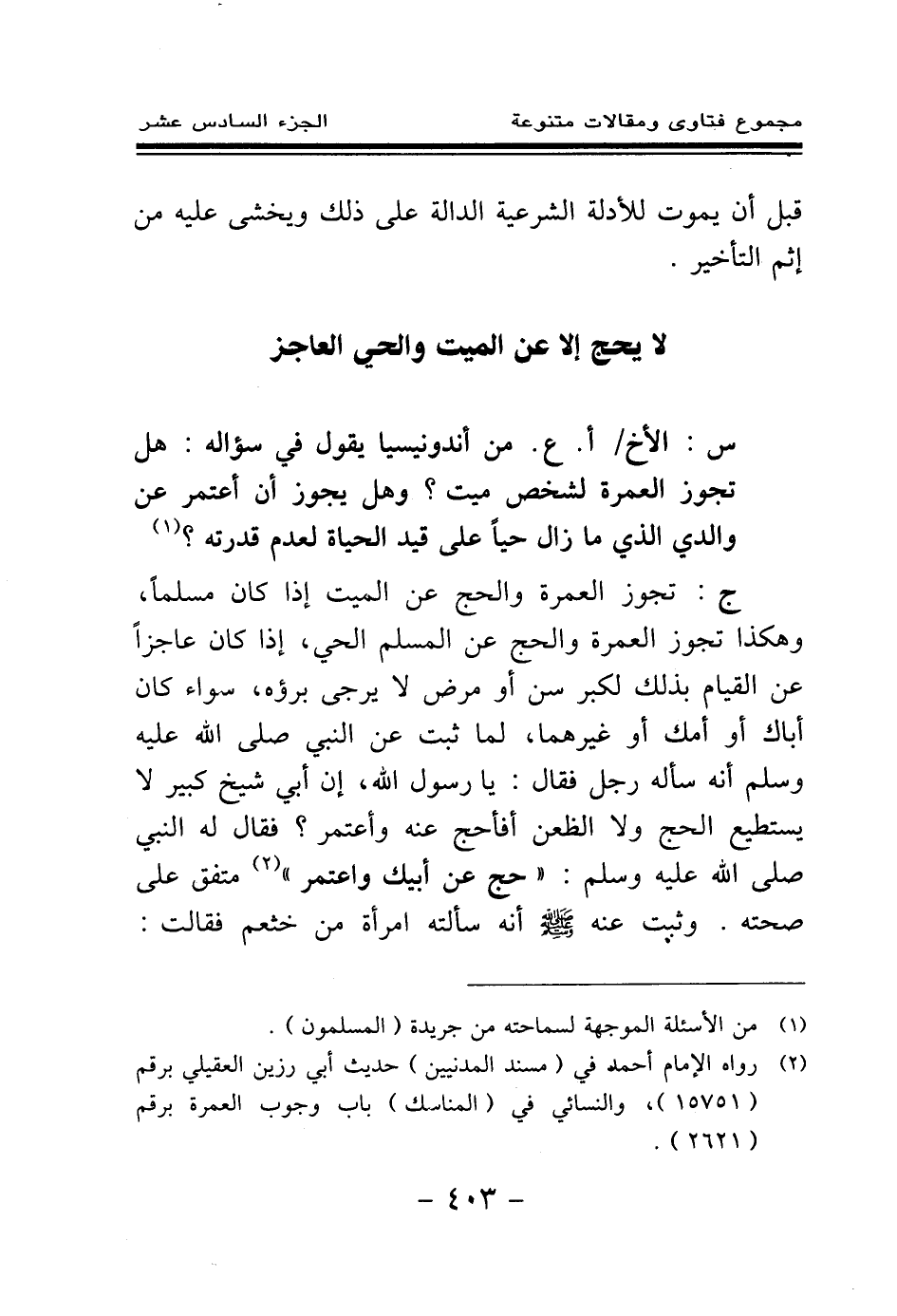 ج: تجوز العمرة والحج عن الميت إذا كان مسلما، وهكذا تجوز العمرة والحج عن المسلم الحي، إذا كان عاجزا عن القيام بذلك لكبر سن أو مرض لا يرجى برؤه، سواء كان أباك أو أمك أو غيرهما، لما ثبت عن النبي - صلى الله عليه وسلم - أنه «سأله رجل فقال: يا رسول الله، إن أبي شيخ كبير لا يستطيع الحج ولا الظعن أفأحج عنه وأعتمر؟ فقال له النبي - صلى الله عليه وسلم -: حج عن أبيك واعتمر (¬2) » . متفق على صحته. وثبت عنه - صلى الله عليه وسلم - أنه «سألته امرأة من خثعم فقالت: