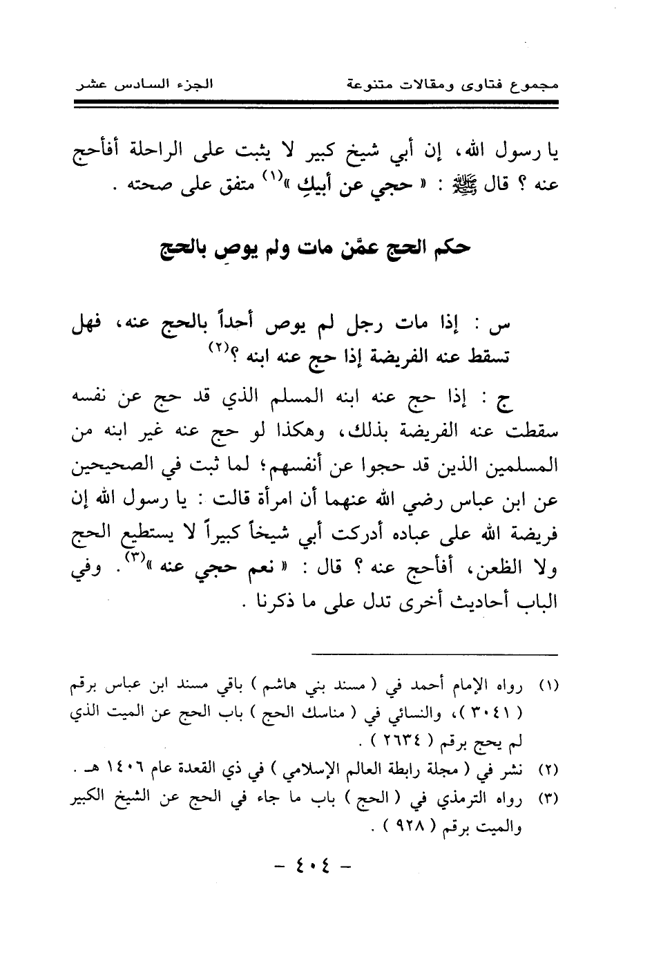 (¬2) رواه الترمذي في (الحج) باب ما جاء في الحج عن الشيخ الكبير والميت برقم (928) .