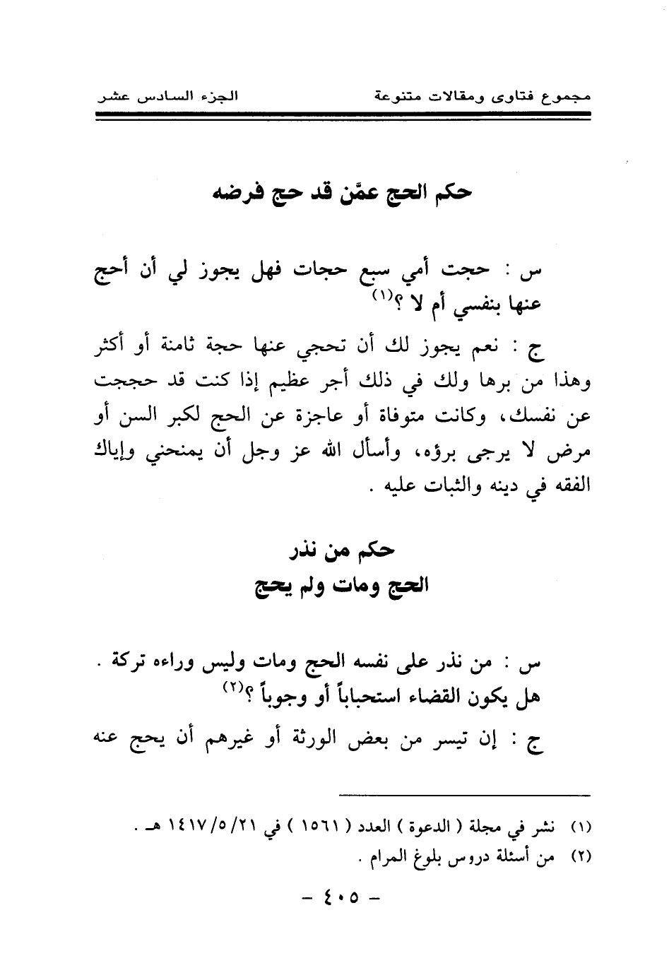 س: من نذر على نفسه الحج ومات وليس وراءه تركة. هل يكون القضاء استحبابا أو وجوبا؟ (¬1) .