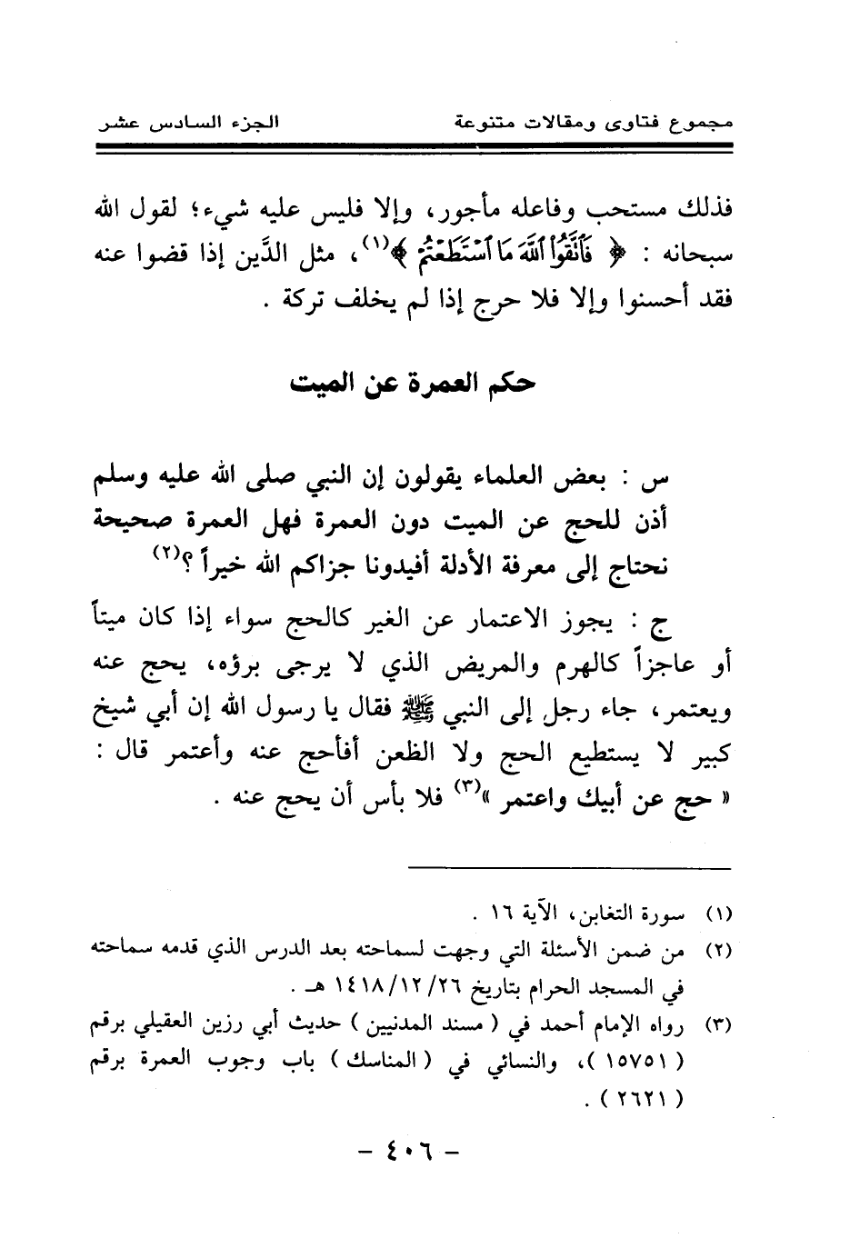 ج: يجوز الاعتمار عن الغير كالحج سواء إذا كان ميتا أو عاجزا كالهرم والمريض الذي لا يرجى برؤه، يحج عنه ويعتمر، «جاء رجل إلى النبي - صلى الله عليه وسلم - فقال يا رسول الله إن أبي شيخ كبير لا يستطيع الحج ولا الظعن أفأحج عنه وأعتمر قال: حج عن أبيك واعتمر (¬1) » . فلا بأس أن يحج عنه.