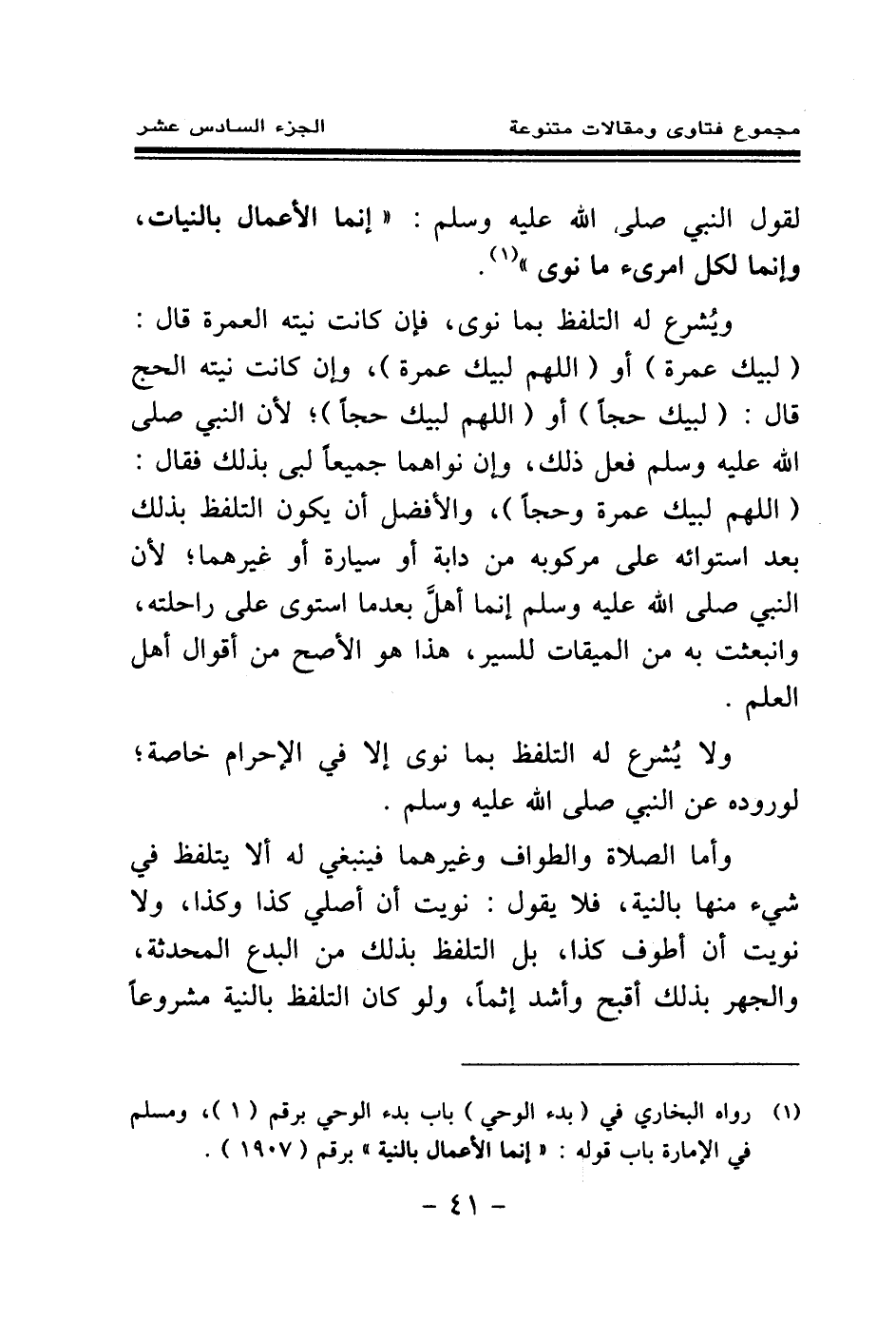 ويشرع له التلفظ بما نوى، فإن كانت نيته العمرة قال: (لبيك عمرة) أو (اللهم لبيك عمرة) ، وإن كانت نيته الحج قال: (لبيك حجا) أو (اللهم لبيك حجا) ؛ لأن النبي صلى الله عليه وسلم فعل ذلك، وإن نواهما جميعا لبى بذلك فقال: (اللهم لبيك عمرة وحجا) ، والأفضل أن يكون التلفظ بذلك بعد استوائه على مركوبه من دابة أو سيارة أو غيرهما؛ لأن النبي صلى الله عليه وسلم إنما أهل بعد ما استوى على راحلته، وانبعثت به من الميقات للسير، هذا هو الأصح من أقوال أهل العلم.
