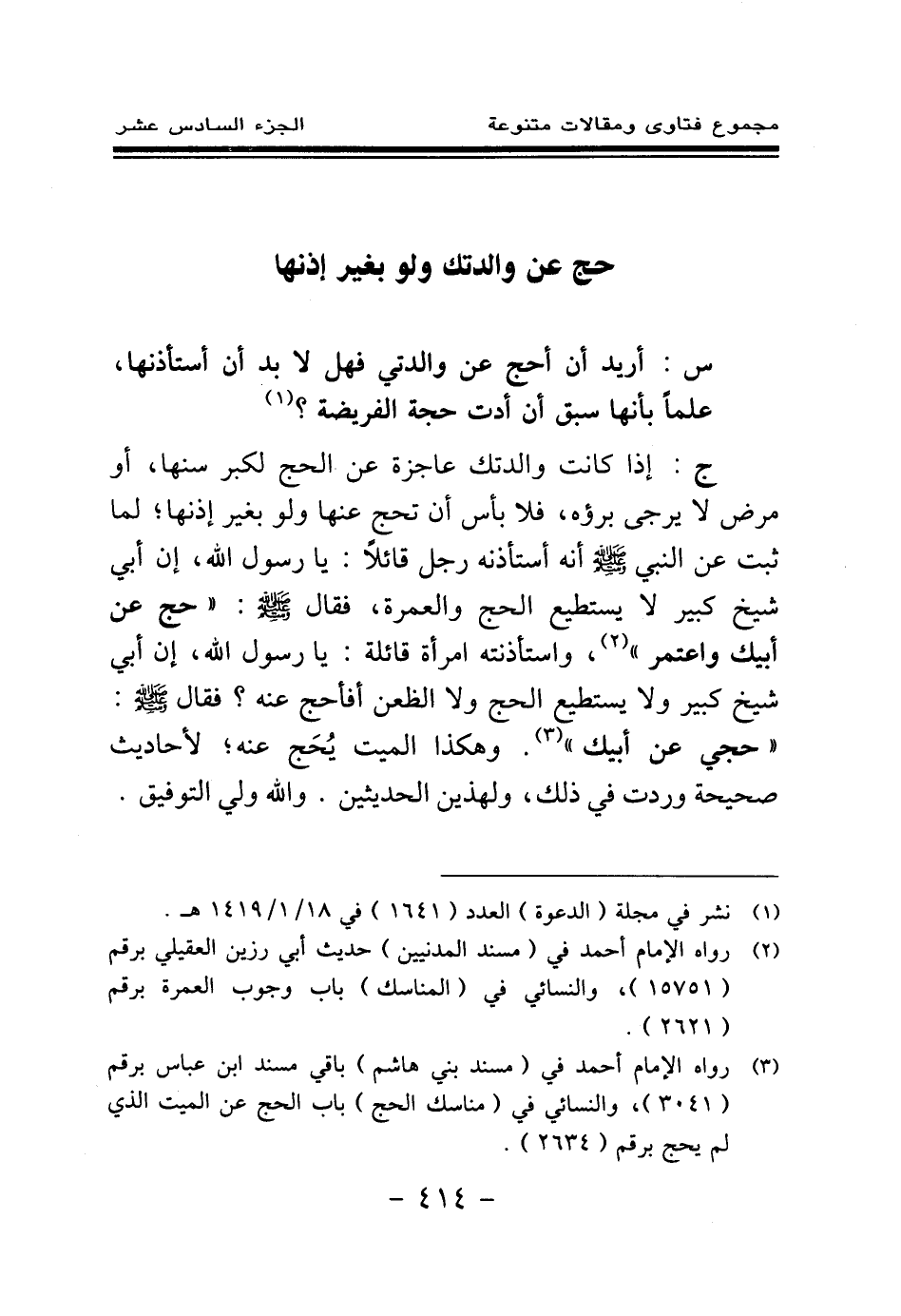 ج: إذا كانت والدتك عاجزة عن الحج لكبر سنها، أو مرض لا يرجى برؤه، فلا بأس أن تحج عنها ولو بغير إذنها؛ لما ثبت عن النبي - صلى الله عليه وسلم - أنه «استأذنه رجل قائلا: يا رسول الله، إن أبي شيخ كبير لا يستطيع الحج والعمرة، فقال - صلى الله عليه وسلم -: حج عن أبيك واعتمر (¬2) » ، «واستأذنته امرأة قائلة: يا رسول الله، إن أبي شيخ كبير ولا يستطيع الحج ولا الظعن أفأحج عنه؟ فقال - صلى الله عليه وسلم -: حجي عن أبيك (¬3) » . وهكذا الميت يحج عنه؛ لأحاديث صحيحة وردت في ذلك، ولهذين الحديثين. والله ولي التوفيق.