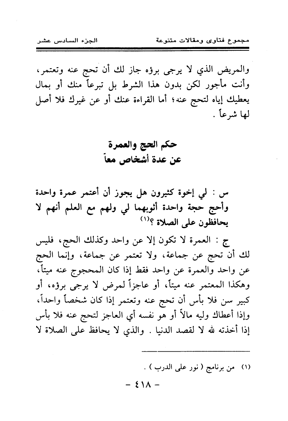 ج: العمرة لا تكون إلا عن واحد وكذلك الحج، فليس لك أن تحج عن جماعة، ولا تعتمر عن جماعة، وإنما الحج عن واحد والعمرة عن واحد فقط إذا كان المحجوج عنه ميتا، وهكذا المعتمر عنه ميتا، أو عاجزا لمرض لا يرجى برؤه، أو كبير سن فلا بأس أن تحج عنه وتعتمر إذا كان شخصا واحدا، وإذا أعطاك وليه مالا أو هو نفسه أي العاجز لتحج عنه فلا بأس إذا أخذته لله لا لقصد الدنيا. والذي لا يحافظ على الصلاة لا