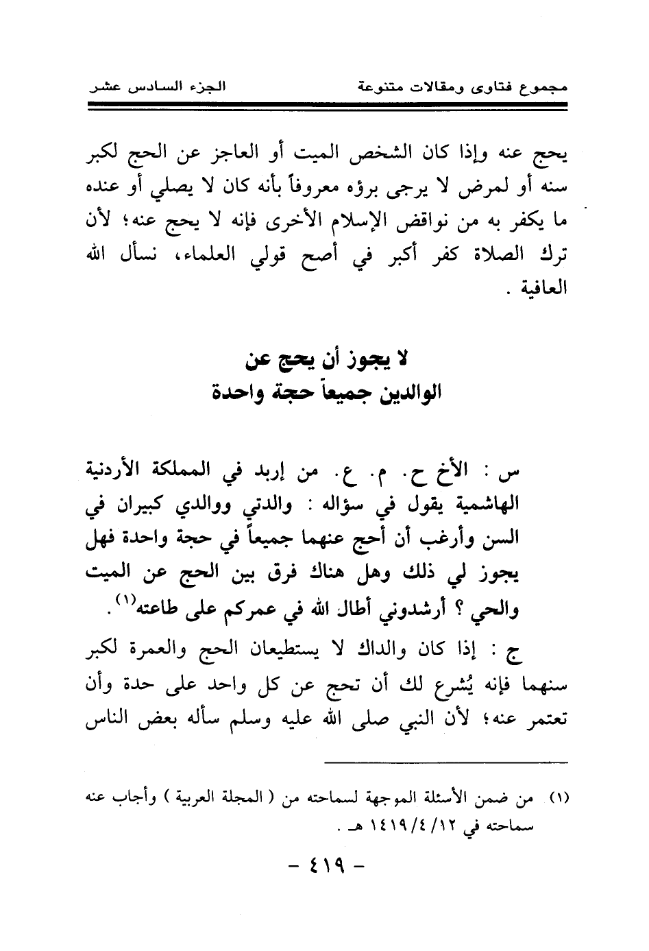 س: الأخ ح. م. ع. من إربد في المملكة الأردنية الهاشمية يقول في سؤاله: والدتي ووالدي كبيران في السن وأرغب أن أحج عنهما جميعا في حجة واحدة فهل يجوز لي ذلك وهل هناك فرق بين الحج عن الميت والحي؟ أرشدوني أطال الله في عمركم على طاعته (¬1) .