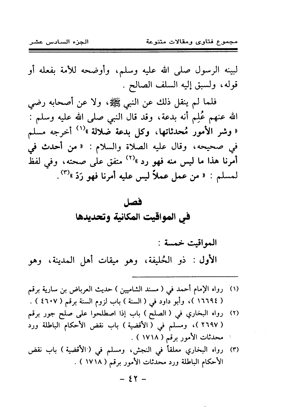 فلما لم ينقل ذلك عن النبي صلى الله عليه وسلم، ولا عن أصحابه رضي الله عنهم علم أنه بدعة، وقد قال النبي صلى الله عليه وسلم: «وشر الأمور محدثاتها، وكل بدعة ضلالة (¬1) » . أخرجه مسلم في صحيحه، وقال عليه الصلاة والسلام: «من أحدث في أمرنا هذا ما ليس منه فهو رد (¬2) » . متفق على صحته، وفي لفظ لمسلم: «من عمل عملا ليس عليه أمرنا فهو رد (¬3) » .