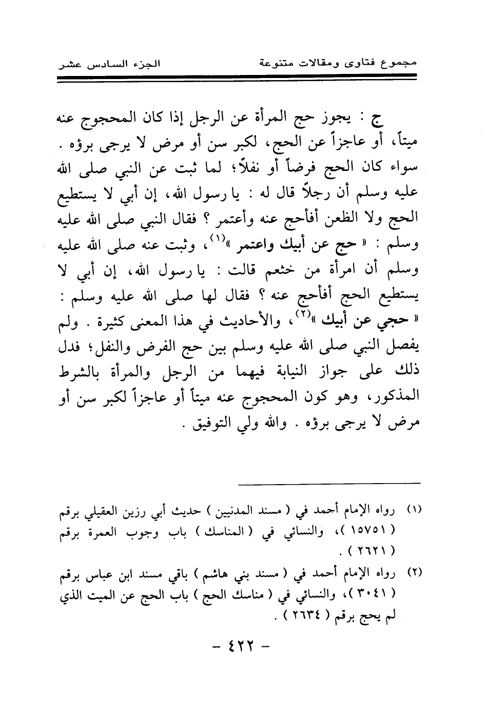(¬1) رواه الإمام أحمد في (مسند المدنيين) حديث أبي رزين العقيلي برقم (15751) ، والنسائي في (المناسك) باب وجوب العمرة برقم (2621)
