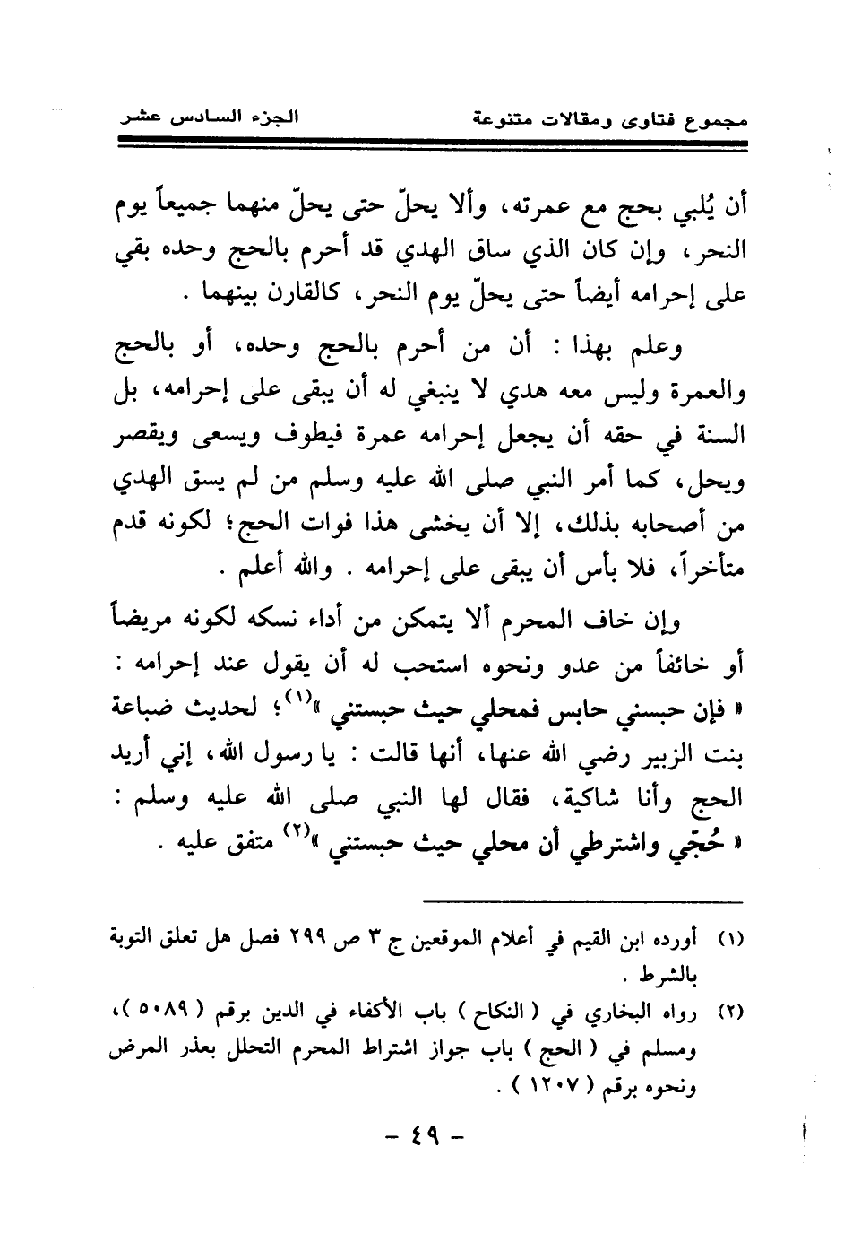 وإن خاف المحرم ألا يتمكن من أداء نسكه لكونه مريضا أو خائفا من عدو ونحوه استحب له أن يقول عند إحرامه: «فإن حبسني حابس فمحلي حيث حبستني (¬1) » ؛ لحديث ضباعة بنت الزبير رضي الله عنها، أنها قالت: «يا رسول الله، إني أريد الحج وأنا شاكية، فقال لها النبي صلى الله عليه وسلم: حجي واشترطي أن محلي حيث حبستني (¬2) » متفق عليه.