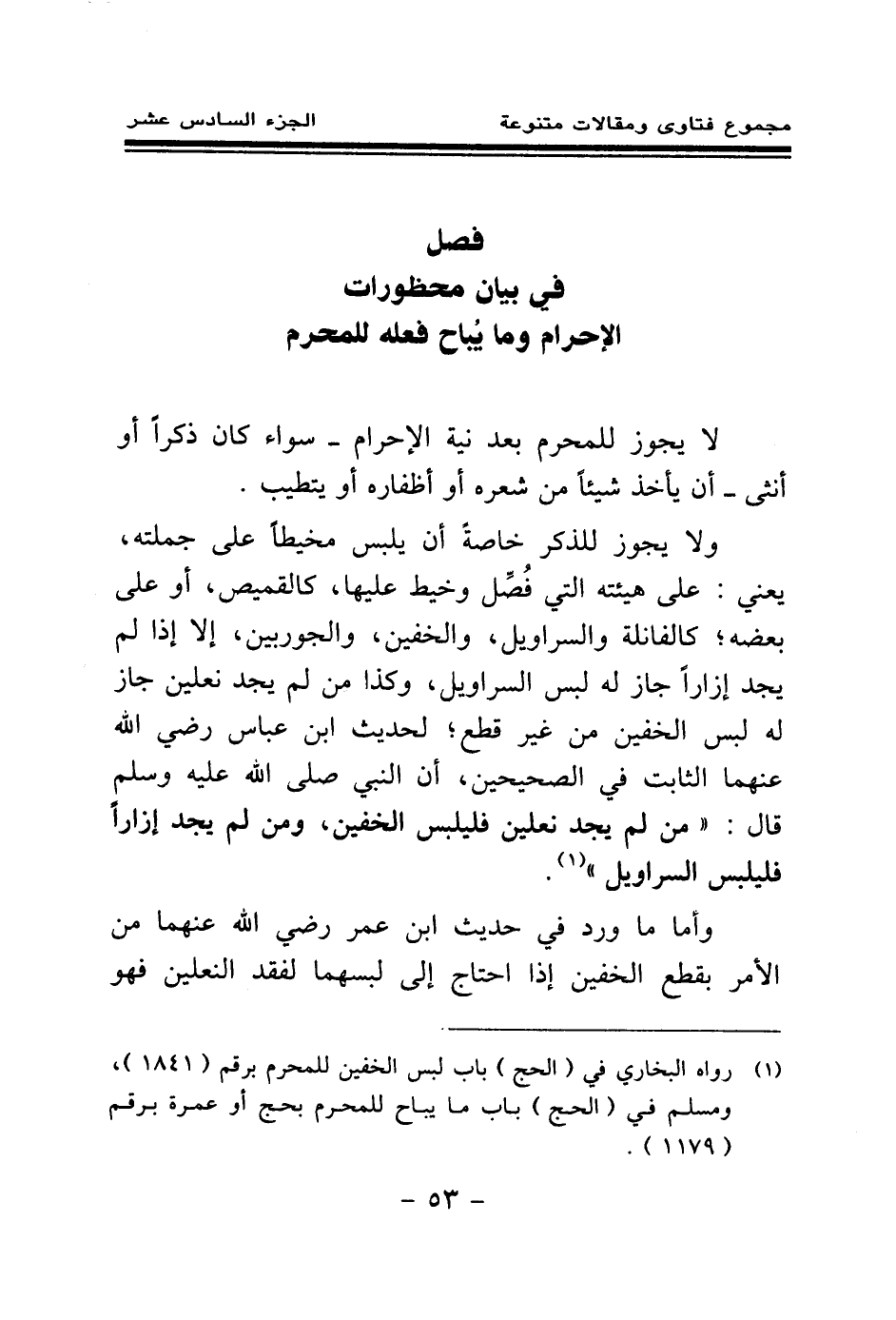 (¬1) رواه البخاري في (الحج) باب لبس الخفين للمحرم برقم (1841) ، ومسلم في (الحج) باب ما يباح للمحرم بحج أو عمرة برقم (1179) .