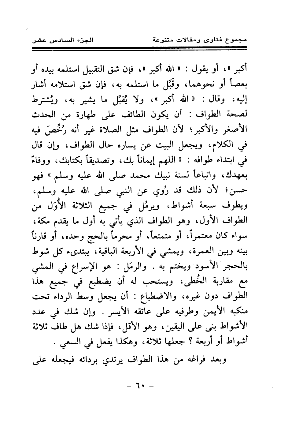 أكبر "، أو يقول: " الله أكبر "، فإن شق التقبيل استلمه بيده أو بعصا أو نحوهما، وقبل ما استلمه به، فإن شق استلامه أشار إليه، وقال: " الله أكبر"، ولا يقبل ما يشير به، ويشترط لصحة الطواف: أن يكون الطائف على طهارة من الحدث الأصغر والأكبر؛ لأن الطواف مثل الصلاة غير أنه رخص فيه في الكلام، ويجعل البيت عن يساره حال الطواف، وإن قال في ابتداء طوافه: «اللهم إيمانا بك، وتصديقا بكتابك، ووفاء بعهدك، واتباعا لسنة نبيك محمد صلى الله عليه وسلم» فهو حسن؛ لأن ذلك قد روي عن النبي صلى الله عليه وسلم، ويطوف سبعة أشواط، ويرمل في جميع الثلاثة الأول من الطواف الأول، وهو الطواف الذي يأتي به أول ما يقدم مكة، سواء كان معتمرا، أو متمتعا، أو محرما بالحج وحده، أو قارنا بينه وبين العمرة، ويمشي في الأربعة الباقية، يبتدئ كل شوط بالحجر الأسود ويختم به. والرمل: هو الإسراع في المشي مع مقاربة الخطى، ويستحب له أن يضطبع في جميع هذا الطواف دون غيره، والاضطباع: أن يجعل وسط الرداء تحت منكبه الأيمن وطرفيه على عاتقه الأيسر. وإن شك في عدد الأشواط بنى على اليقين، وهو الأقل، فإذا شك هل طاف ثلاثة أشواط أو أربعة؟ جعلها ثلاثة، وهكذا يفعل في السعي.