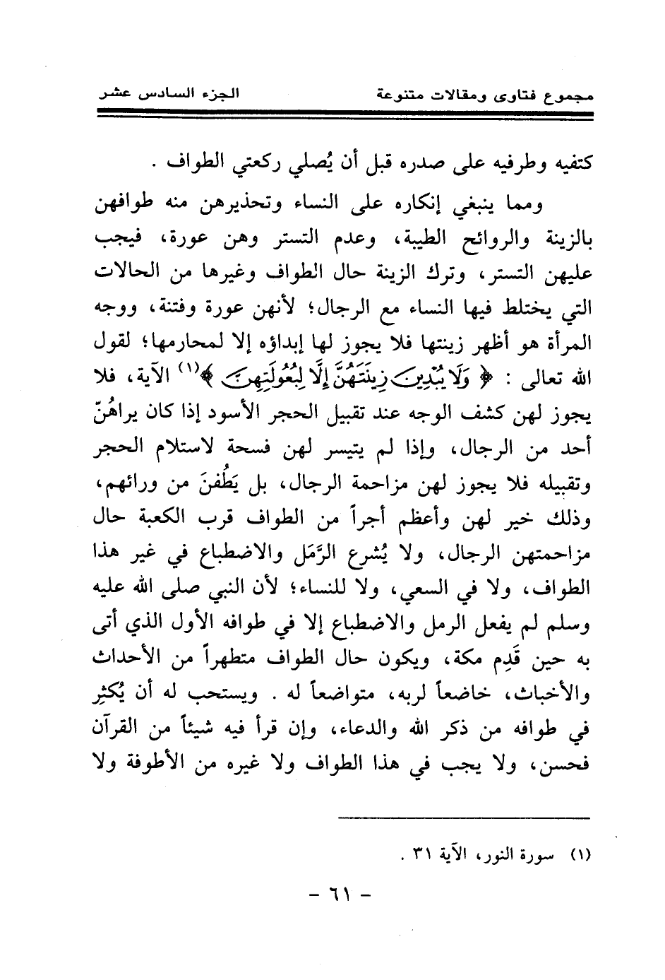 ومما ينبغي إنكاره على النساء وتحذيرهن منه طوافهن بالزينة والروائح الطيبة، وعدم التستر وهن عورة، فيجب عليهن التستر، وترك الزينة حال الطواف وغيرها من الحالات التي يختلط فيها النساء مع الرجال؛ لأنهن عورة وفتنة، ووجه المرأة هو أظهر زينتها فلا يجوز لها إبداؤه إلا لمحارمها؛ لقول الله تعالى: {وَلَا يُبْدِينَ زِينَتَهُنَّ إِلَّا لِبُعُولَتِهِنَّ} (¬1) الآية، فلا يجوز لهن كشف الوجه عند تقبيل الحجر الأسود إذا كان يراهن أحد من الرجال، وإذا لم يتيسر لهن فسحة لاستلام الحجر وتقبيله فلا يجوز لهن مزاحمة الرجال، بل يطفن من ورائهم، وذلك خير لهن وأعظم أجرا من الطواف قرب الكعبة حال مزاحمتهن الرجال، ولا يشرع الرمل والاضطباع في غير هذا الطواف، ولا في السعي، ولا للنساء؛ لأن النبي صلى الله عليه وسلم لم يفعل الرمل والاضطباع إلا في طوافه الأول الذي أتى به حين قدم مكة، ويكون حال الطواف متطهرا من الأحداث والأخباث، خاضعا لربه، متواضعا له. ويستحب له أن يكثر في طوافه من ذكر الله والدعاء، وإن قرأ فيه شيئا من القرآن فحسن، ولا يجب في هذا الطواف ولا غيره من الأطوفة ولا