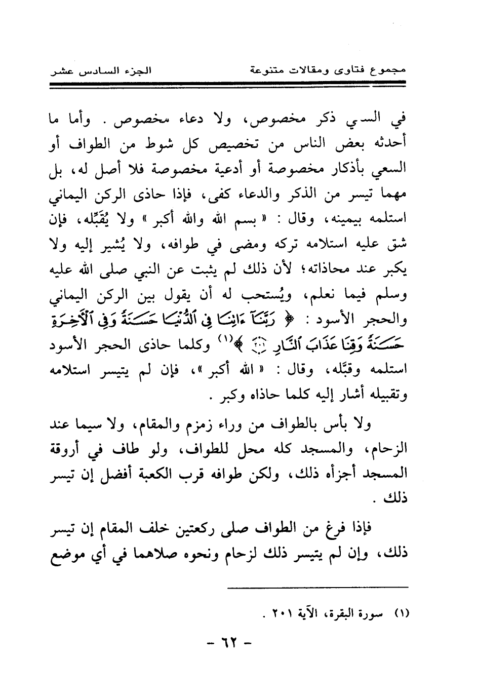 في السعي ذكر مخصوص، ولا دعاء مخصوص. وأما ما أحدثه بعض الناس من تخصيص كل شوط من الطواف أو السعي بأذكار مخصوصة أو أدعية مخصوصة فلا أصل له، بل مهما تيسر من الذكر والدعاء كفى، فإذا حاذى الركن اليماني استلمه بيمينه، وقال: " بسم الله والله أكبر " ولا يقبله، فإن شق عليه استلامه تركه ومضى في طوافه، ولا يشير عليه ولا يكبر عند محاذاته؛ لأن ذلك لم يثبت عن النبي صلى الله عليه وسلم فيما نعلم، ويستحب له أن يقول بين الركن اليماني والحجر الأسود: {رَبَّنَا آتِنَا فِي الدُّنْيَا حَسَنَةً وَفِي الْآخِرَةِ حَسَنَةً وَقِنَا عَذَابَ النَّارِ} (¬1) وكلما حاذى الحجر الأسود استلمه وقبله، وقال: " الله أكبر"، فإن لم يتيسر استلامه وتقبيله أشار إليه كلما حاذاه وكبر.