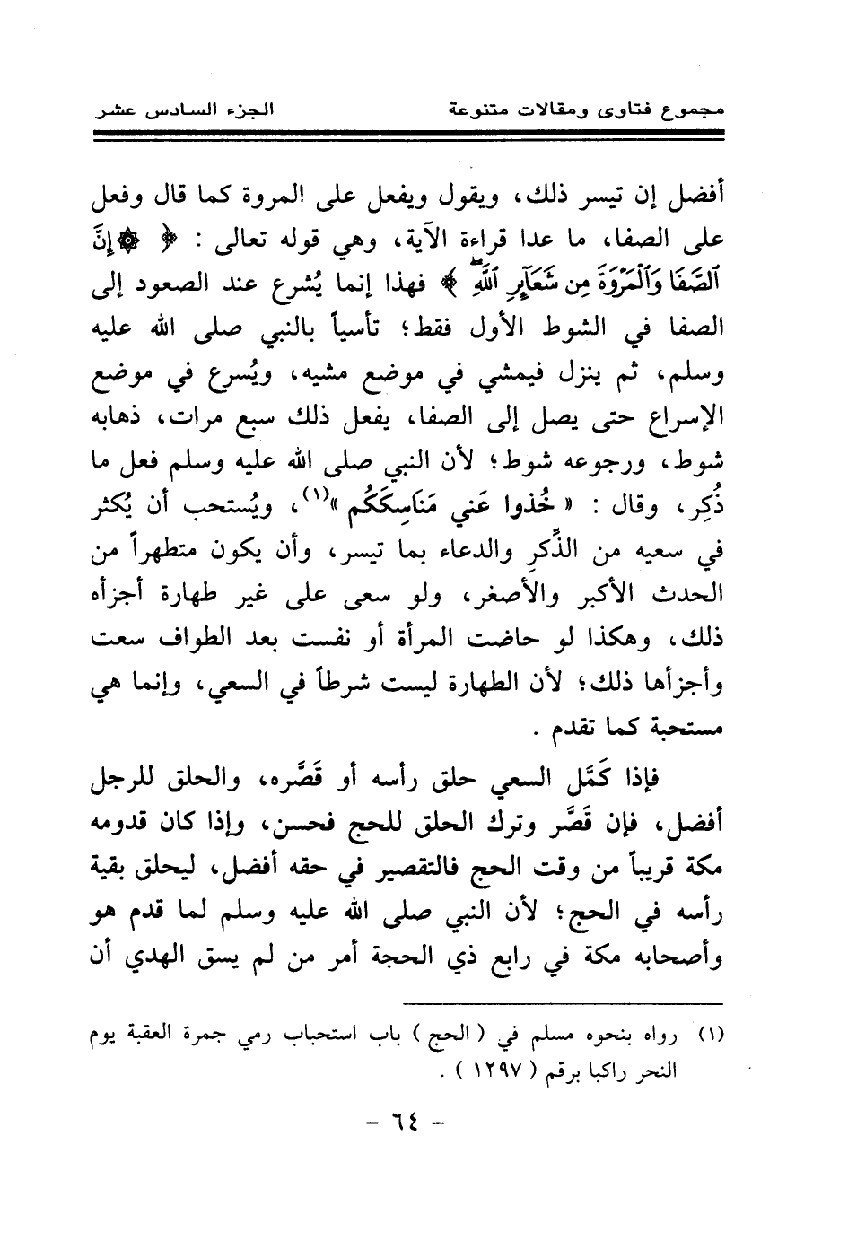 أفضل إن تيسر ذلك، ويقول ويفعل على المروة كما قال وفعل على الصفا، ما عدا قراءة الآية، وهي قوله تعالى: {إِنَّ الصَّفَا وَالْمَرْوَةَ مِنْ شَعَائِرِ اللَّهِ} (¬1) فهذا إنما يشرع عند الصعود إلى الصفا في الشوط الأول فقط؛ تأسيا بالنبي صلى الله عليه وسلم، ثم ينزل فيمشي في موضع مشيه، ويسرع في موضع الإسراع حتى يصل إلى الصفا، يفعل ذلك سبع مرات، ذهابه شوط، ورجوعه شوط؛ لأن النبي صلى الله عليه وسلم فعل ما ذكر، وقال: «خذوا عني مناسككم (¬2) » ، ويستحب أن يكثر في سعيه من الذكر والدعاء بما تيسر، وأن يكون متطهرا من الحدث الأكبر والأصغر، ولو سعى على غير طهارة أجزأه ذلك، وهكذا لو حاضت المرأة أو نفست بعد الطواف سعت وأجزأها ذلك؛ لأن الطهارة ليست شرطا في السعي، وإنما هي مستحبة كما تقدم.