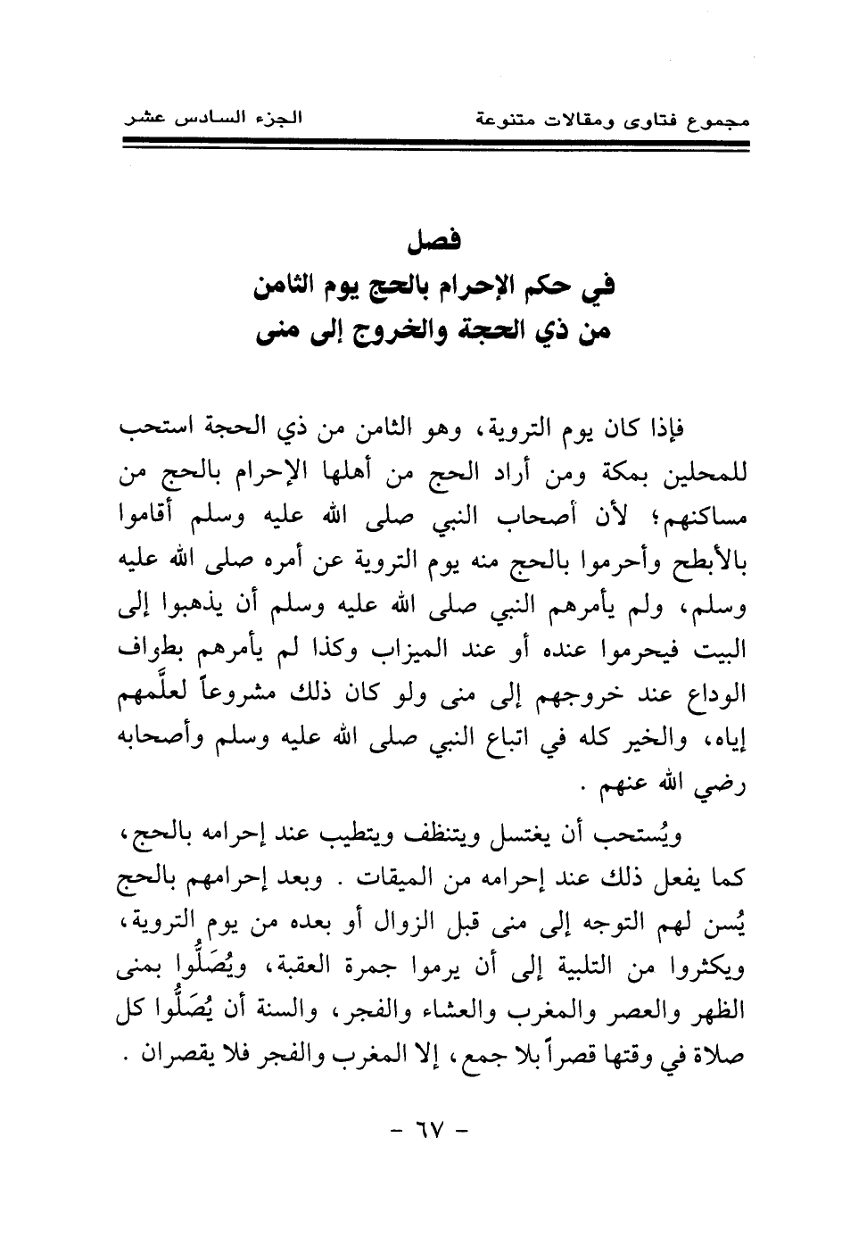 ويستحب أن يغتسل ويتنظف ويتطيب عند إحرامه بالحج، كما يفعل ذلك عند إحرامه من الميقات. وبعد إحرامهم بالحج يسن لهم التوجه إلى منى قبل الزوال أو بعده من يوم التروية، ويكثروا من التلبية إلى أن يرموا جمرة العقبة، ويصلوا بمنى الظهر والعصر والمغرب والعشاء والفجر، والسنة أن يصلوا كل صلاة في وقتها قصرا بلا جمع، إلا المغرب والفجر فلا يقصران.