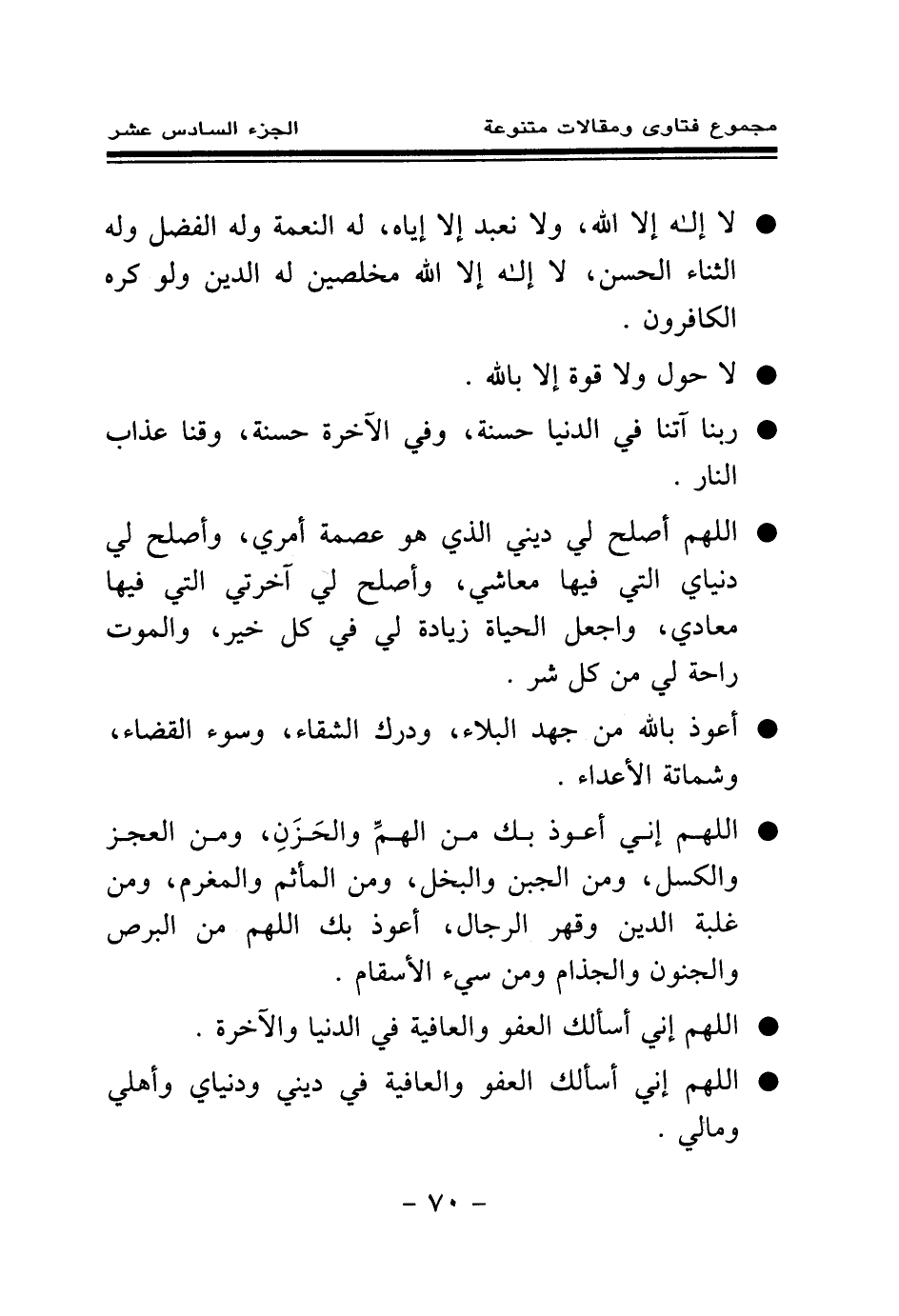 * اللهم أصلح لي ديني الذي هو عصمة أمري، وأصلح لي دنياي التي فيها معاشي، وأصلح لي آخرتي التي فيها معادي، واجعل الحياة زيادة لي في كل خير، والموت راحة لي من كل شر.