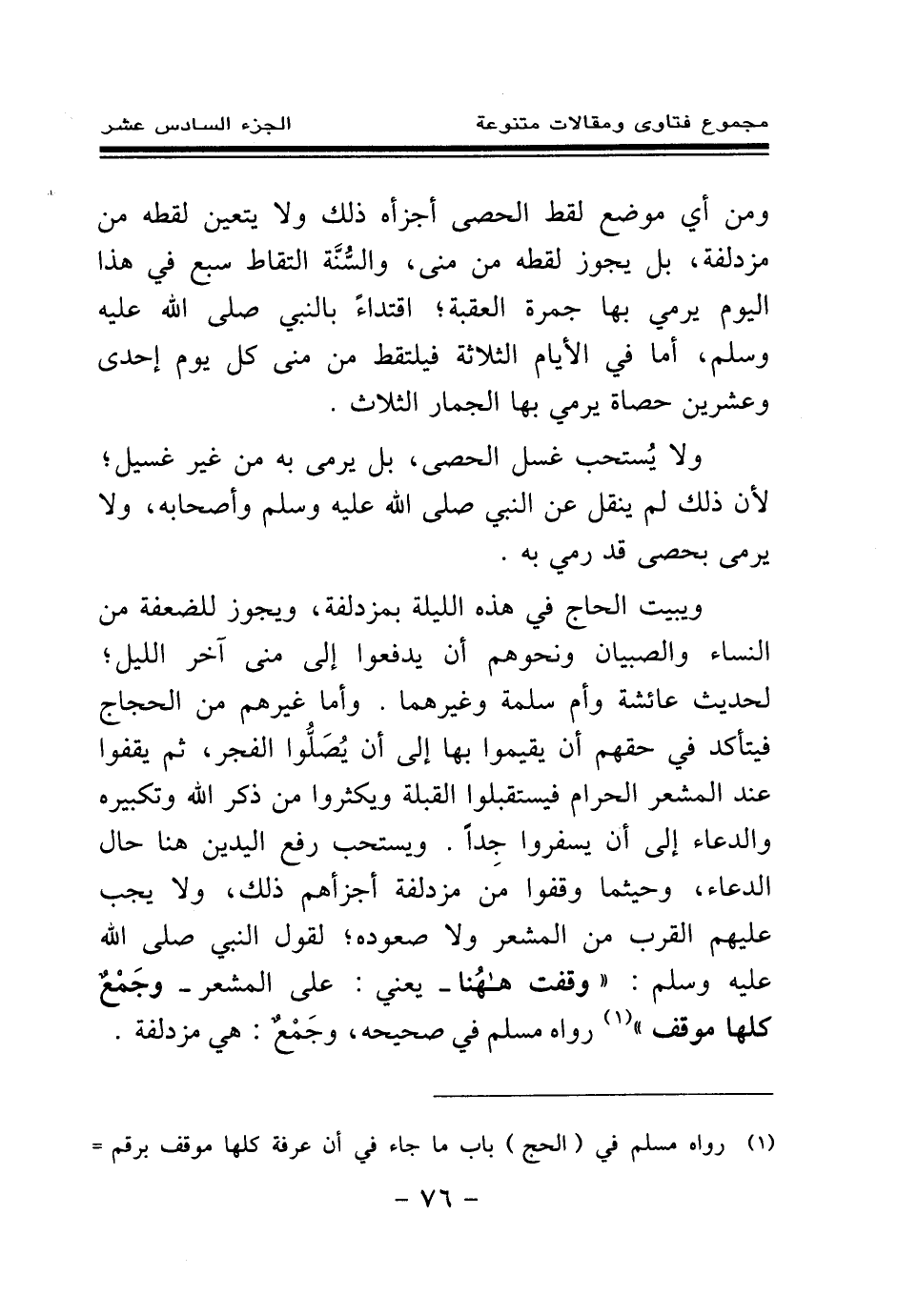 ويبيت الحاج في هذه الليلة بمزدلفة، ويجوز للضعفة من النساء والصبيان ونحوهم أن يدفعوا إلى منى آخر الليل؛ لحديث عائشة وأم سلمة وغيرهما. وأما غيرهم من الحجاج فيتأكد في حقهم أن يقيموا بها إلى أن يصلوا الفجر، ثم يقفوا عند المشعر الحرام فيستقبلوا القبلة ويكثروا من ذكر الله وتكبيره والدعاء إلى أن يسفروا جدا. ويستحب رفع اليدين هنا حال الدعاء، وحيثما وقفوا من مزدلفة أجزأهم ذلك، ولا يجب عليهم القرب من المشعر ولا صعوده؛ لقول النبي صلى الله عليه وسلم: «وقفت ههنا - يعني: على المشعر - وجمع كلها موقف (¬1) » رواه مسلم في صحيحه، وجمع: هي مزدلفة.