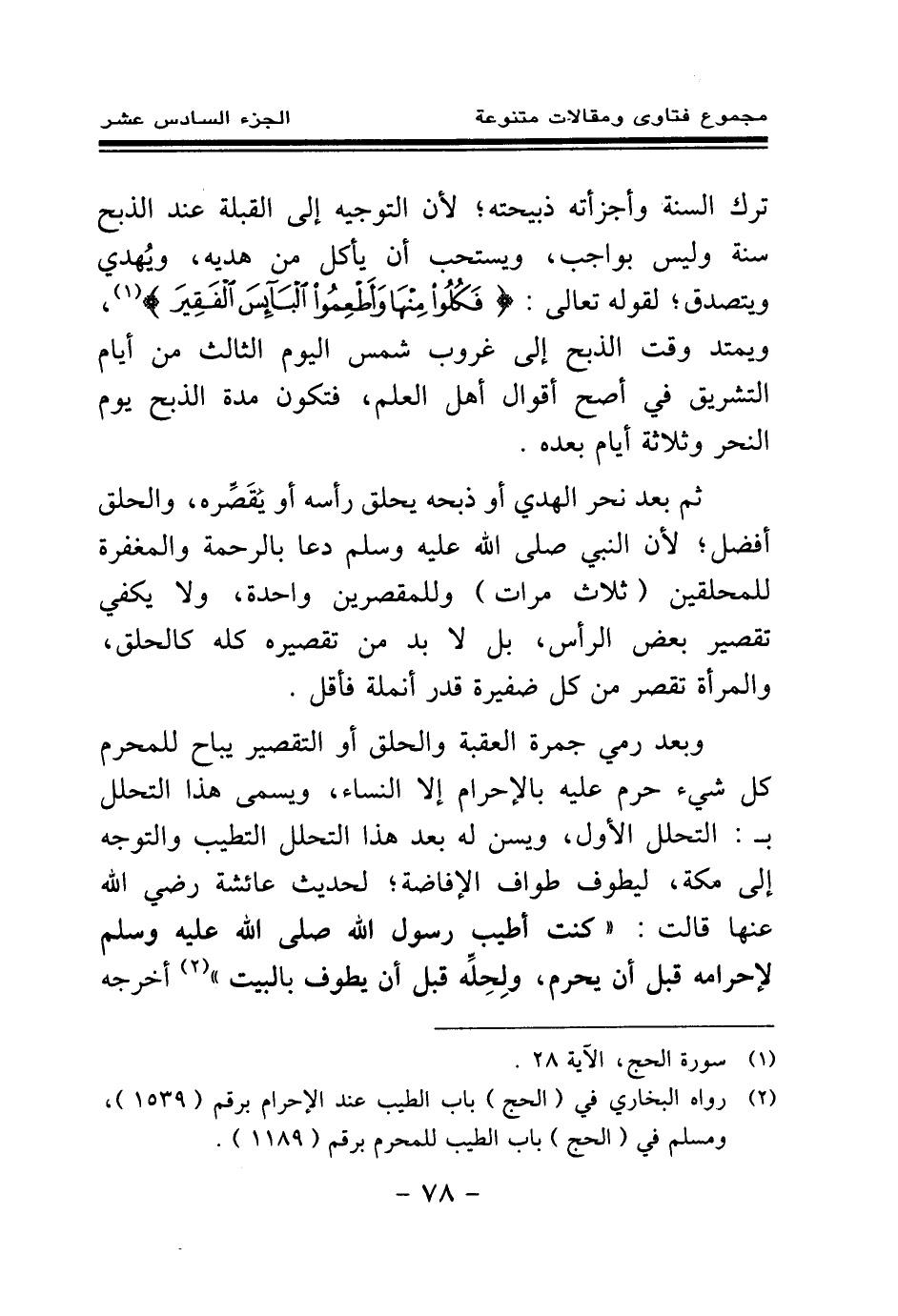ترك السنة وأجزأته ذبيحته؛ لأن التوجيه إلى القبلة عند الذبح سنة وليس بواجب، ويستحب أن يأكل من هديه، ويهدي ويتصدق؛ لقوله تعالى: {فَكُلُوا مِنْهَا وَأَطْعِمُوا الْبَائِسَ الْفَقِيرَ} (¬1) ويمتد وقت الذبح إلى غروب شمس اليوم الثالث من أيام التشريق في أصح أقوال أهل العلم، فتكون مدة الذبح يوم النحر وثلاثة أيام بعده.
