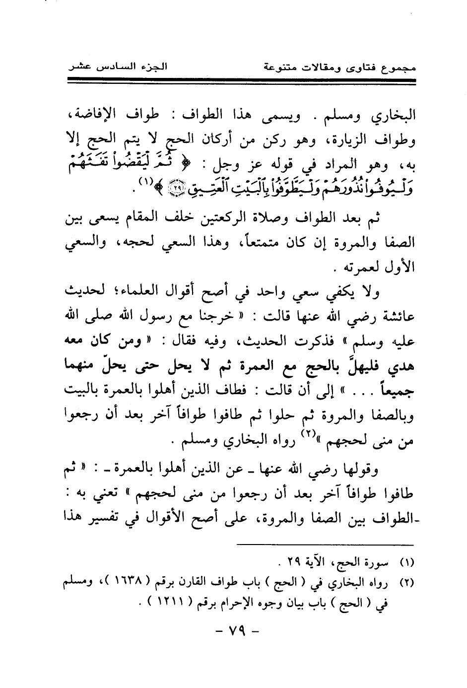 البخاري ومسلم. ويسمى هذا الطواف: طواف الإفاضة، وطواف الزيارة، وهو ركن من أركان الحج لا يتم الحج إلا به، وهو المراد في قوله عز وجل: {ثُمَّ لْيَقْضُوا تَفَثَهُمْ وَلْيُوفُوا نُذُورَهُمْ وَلْيَطَّوَّفُوا بِالْبَيْتِ الْعَتِيقِ} (¬1)