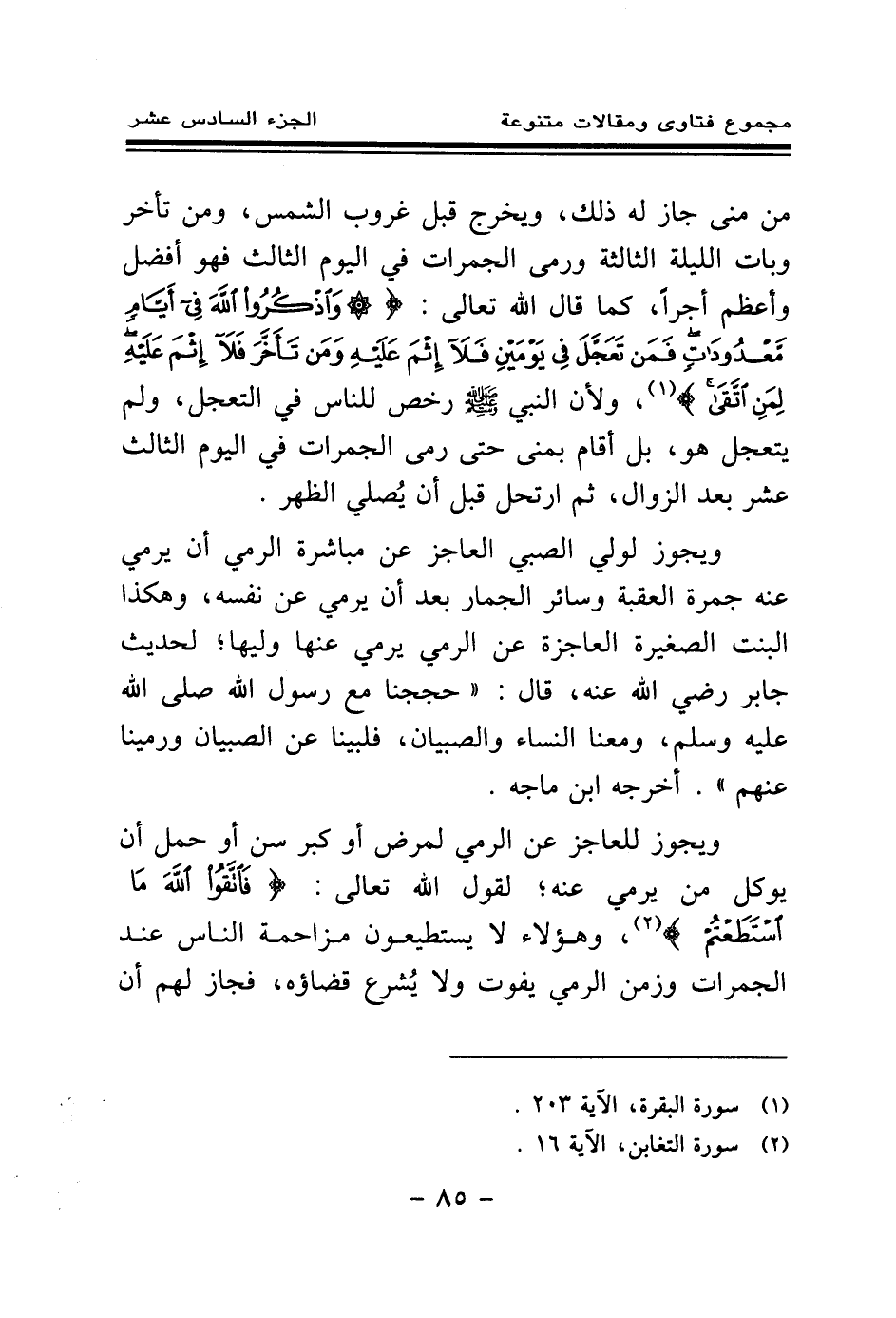 ويجوز للعاجز عن الرمي لمرض أو كبر سن أو حمل أن يوكل من يرمي عنه؛ لقول الله تعالى: {فَاتَّقُوا اللَّهَ مَا اسْتَطَعْتُمْ} (¬3) وهؤلاء لا يستطيعون مزاحمة الناس عند الجمرات وزمن الرمي يفوت ولا يشرع قضاؤه، فجاز لهم أن
