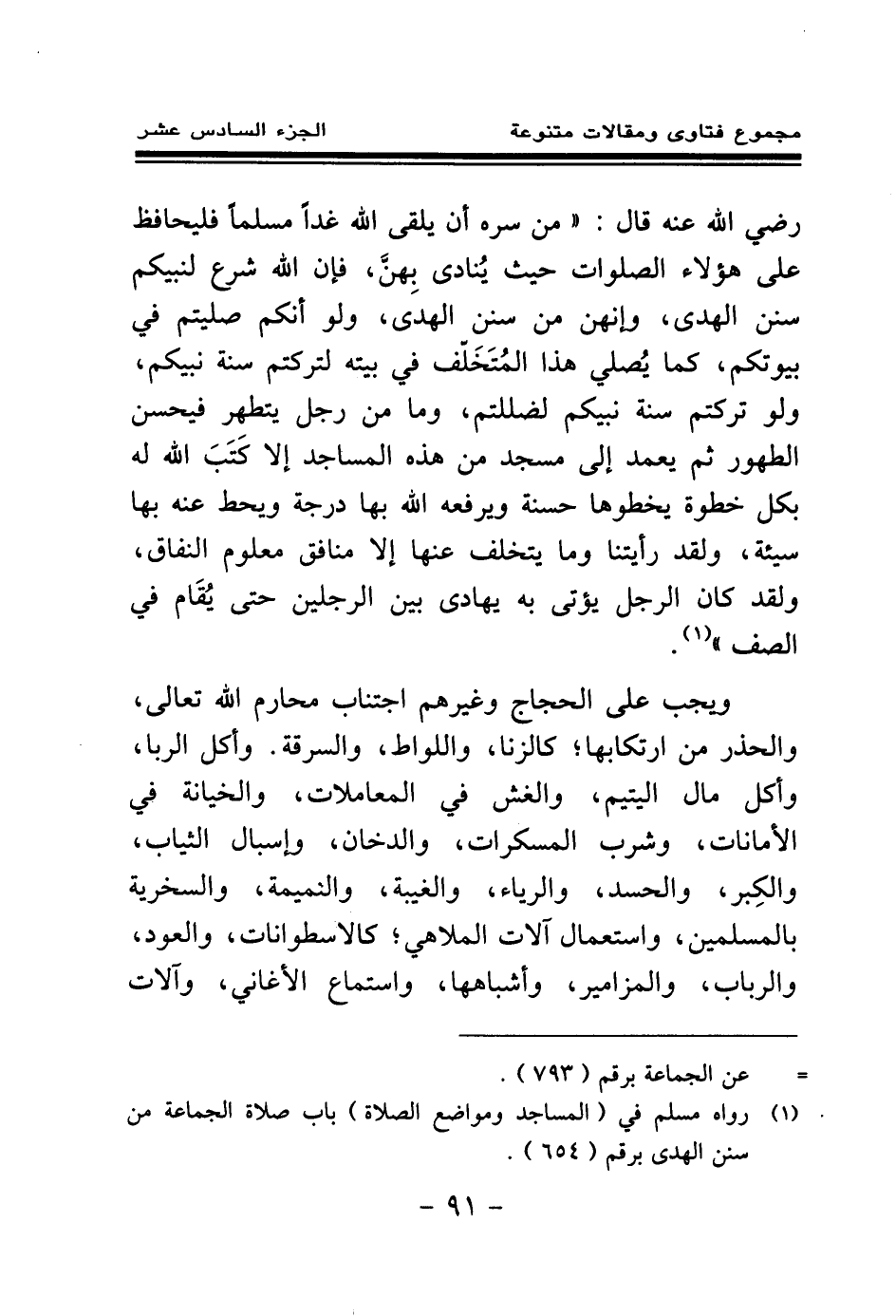 رضي الله عنه قال: " من سره أن يلقى الله غدا مسلما فليحافظ على هؤلاء الصلوات حيث ينادى بهن، فإن الله شرع لنبيكم سنن الهدى، وإنهن من سنن الهدى، ولو أنكم صليتم في بيوتكم، كما يصلي هذا المتخلف في بيته لتركتم سنة نبيكم، ولو تركتم سنة نبيكم لضللتم، وما من رجل يتطهر فيحسن الطهور ثم يعمد إلى مسجد من هذه المساجد إلا كتب الله له بكل خطوة يخطوها حسنة ويرفعه الله بها درجة ويحط عنه بها سيئة، ولقد رأيتنا وما يتخلف عنها إلا منافق معلوم النفاق، ولقد كان الرجل يؤتى به يهادى بين الرجلين حتى يقام في الصف " (¬1) .