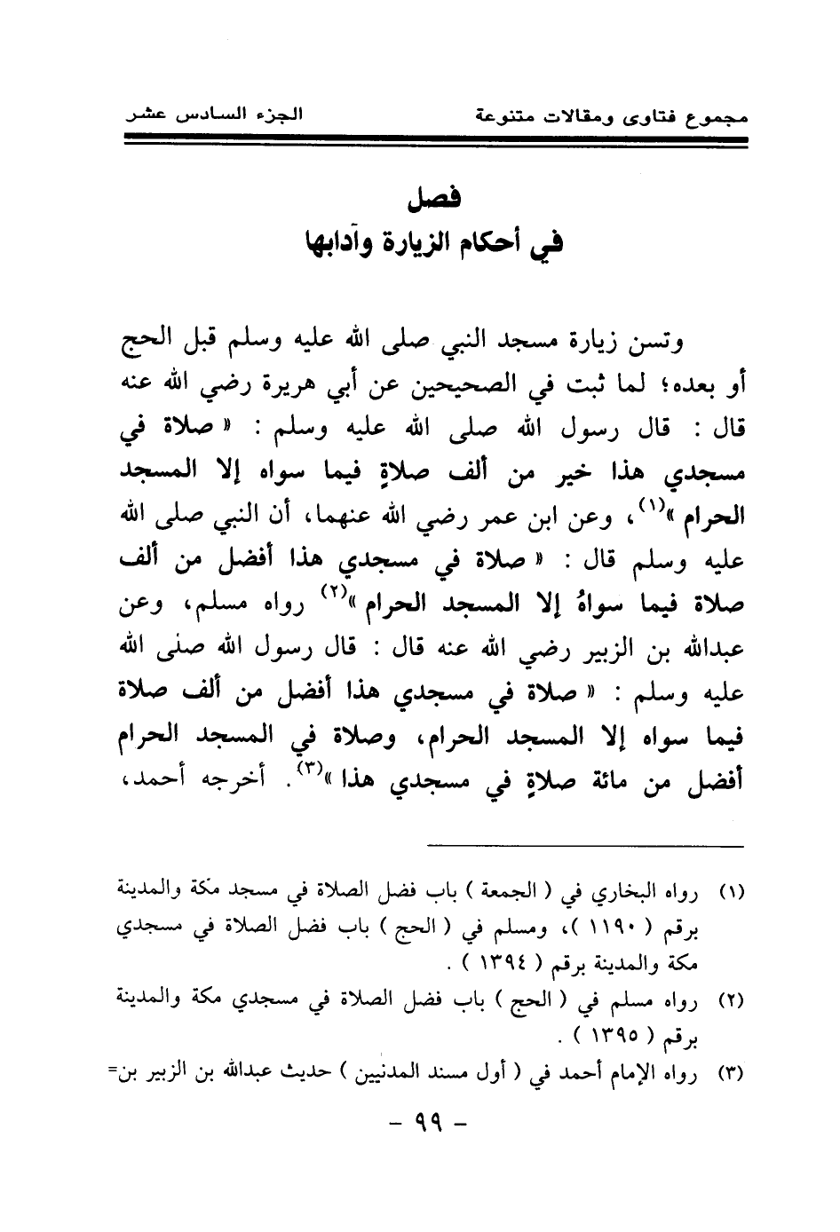 وتسن زيارة مسجد النبي صلى الله عليه وسلم قبل الحج أو بعده؛ لما ثبت في الصحيحين عن أبي هريرة رضي الله عنه قال: قال رسول الله صلى الله عليه وسلم: «صلاة في مسجدي هذا خير من ألف صلاة فيما سواه إلا المسجد الحرام (¬1) » وعن ابن عمر رضي الله عنهما، أن النبي صلى الله عليه وسلم قال: «صلاة في مسجدي هذا أفضل من ألف صلاة فيما سواه إلا المسجد الحرام (¬2) » رواه مسلم، وعن عبد الله بن الزبير رضي الله عنه قال: قال رسول الله صلى الله عليه وسلم: «صلاة في مسجدي هذا أفضل من ألف صلاة فيما سواه إلا المسجد الحرام، وصلاة في المسجد الحرام أفضل من مائة صلاة في مسجدي هذا (¬3) » . أخرجه أحمد،