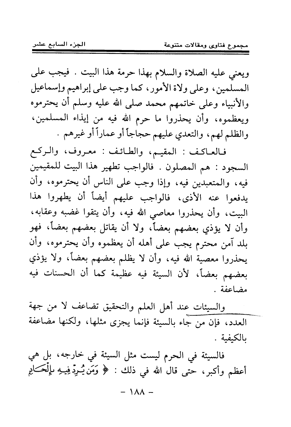 ويعني عليه الصلاة والسلام بهذا حرمة هذا البيت. فيجب على المسلمين، وعلى ولاة الأمور، كما وجب على إبراهيم وإسماعيل والأنبياء وعلى خاتمهم محمد صلى الله عليه وسلم أن يحترموه ويعظموه، وأن يحذروا ما حرم الله فيه من إيذاء المسلمين، والظلم لهم، والتعدي عليهم حجاجا أو عمارا أو غيرهم.