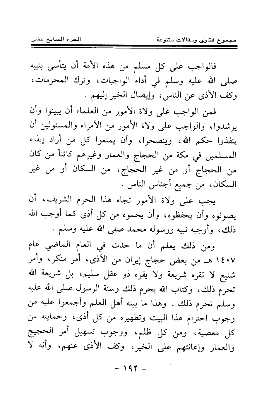 ومن ذلك يعلم أن ما حدث في العام الماضي عام 1407 هـ من بعض حجاج إيران من الأذى، أمر منكر، وأمر شنيع لا تقره شريعة ولا يقره ذو عقل سليم، بل شريعة الله تحرم ذلك، وكتاب الله يحرم ذلك وسنة الرسول صلى الله عليه وسلم تحرم ذلك. وهذا ما بينه أهل العلم وأجمعوا عليه من وجوب احترام هذا البيت وتطهيره من كل أذى، وحمايته من كل معصية، ومن كل ظلم، ووجوب تسهيل أمر الحجيج والعمار وإعانتهم على الخير، وكف الأذى عنهم، وأنه لا