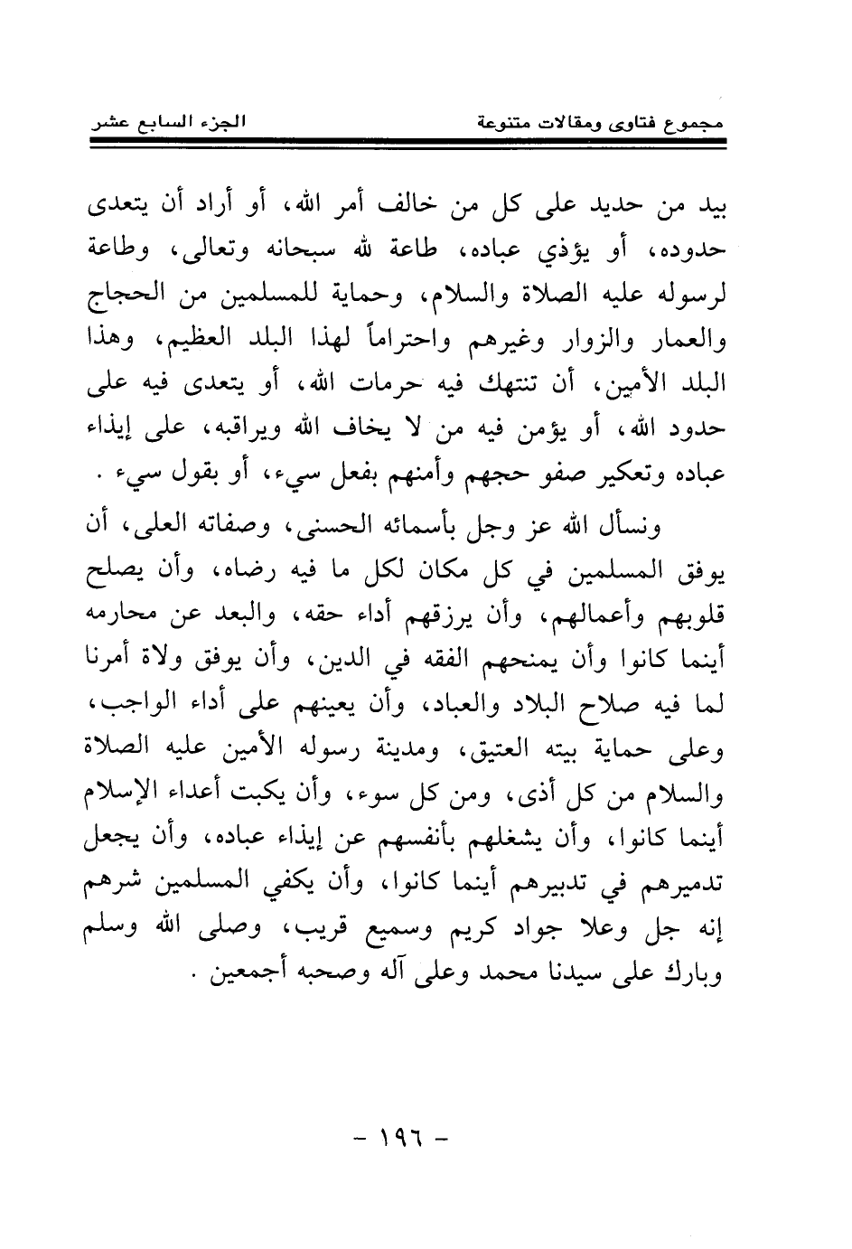 ونسأل الله عز وجل بأسمائه الحسنى، وصفاته العلى، أن يوفق المسلمين في كل مكان لكل ما فيه رضاه، وأن يصلح قلوبهم وأعمالهم، وأن يرزقهم أداء حقه، والبعد عن محارمه أينما كانوا وأن يمنحهم الفقه في الدين، وأن يوفق ولاة أمرنا لما فيه صلاح البلاد والعباد، وأن يعينهم على أداء الواجب، وعلى حماية بيته العتيق، ومدينة رسوله الأمين عليه الصلاة والسلام من كل أذى، ومن كل سوء، وأن يكبت أعداء الإسلام أينما كانوا، وأن يشغلهم بأنفسهم عن إيذاء عباده، وأن يجعل تدميرهم في تدبيرهم أينما كانوا، وأن يكفي المسلمين شرهم إنه جل وعلا جواد كريم وسميع قريب، وصلى الله وسلم وبارك على سيدنا محمد وعلى آله وصحبه أجمعين.