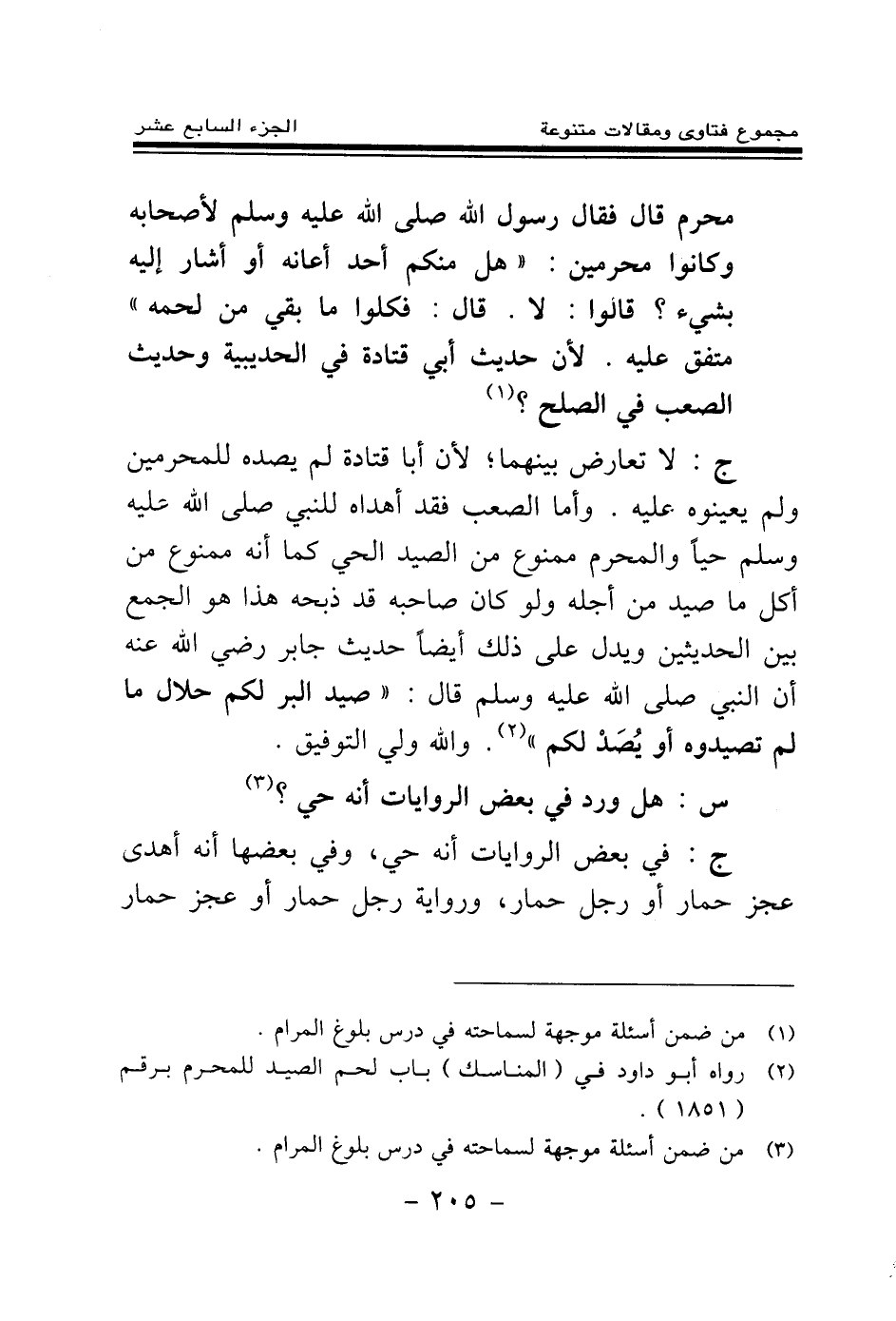 ج: لا تعارض بينهما؛ لأن أبا قتادة لم يصده للمحرمين ولم يعينوه عليه. وأما الصعب فقد أهداه للنبي صلى الله عليه وسلم حيا والمحرم ممنوع من الصيد الحي كما أنه ممنوع من أكل ما صيد من أجله، ولو كان صاحبه قد ذبحه هذا هو الجمع بين الحديثين، ويدل على ذلك أيضا حديث جابر رضي الله عنه أن النبي صلى الله عليه وسلم قال: «صيد البر لكم حلال ما لم تصيدوه أو يصد لكم (¬3) » . والله ولي التوفيق.