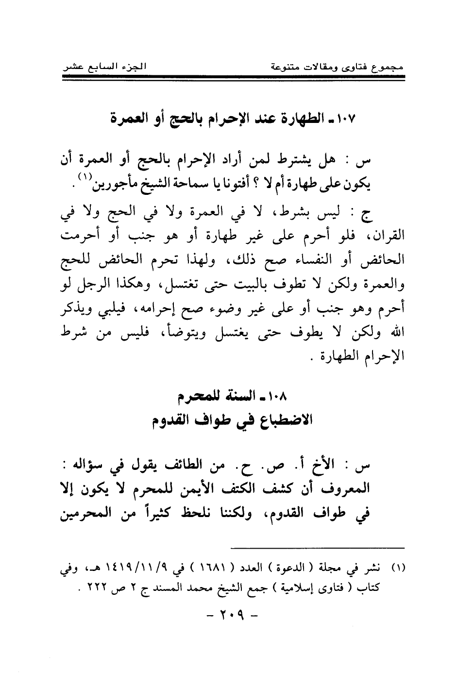 ج: ليس بشرط، لا في العمرة ولا في الحج ولا في القرآن، فلو أحرم على غير طهارة أو هو جنب أو أحرمت الحائض أو النفساء صح ذلك، ولهذا تحرم الحائض للحج والعمرة ولكن لا تطوف بالبيت حتى تغتسل، وهكذا الرجل لو أحرم وهو جنب أو على غير وضوء صح إحرامه، فيلبي ويذكر الله ولكن لا يطوف حتى يغتسل ويتوضأ، فليس من شرط الإحرام الطهارة.