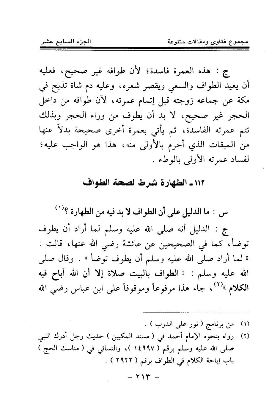 ج: الدليل أنه صلى الله عليه وسلم لما أراد أن يطوف توضأ، كما في الصحيحين عن عائشة رضي الله عنها، قالت: «لما أراد صلى الله عليه وسلم أن يطوف توضأ» . وقال صلى الله عليه وسلم: «الطواف بالبيت صلاة إلا أن الله أباح فيه الكلام (¬2) » ، جاء هذا مرفوعا وموقوفا على ابن عباس رضي الله