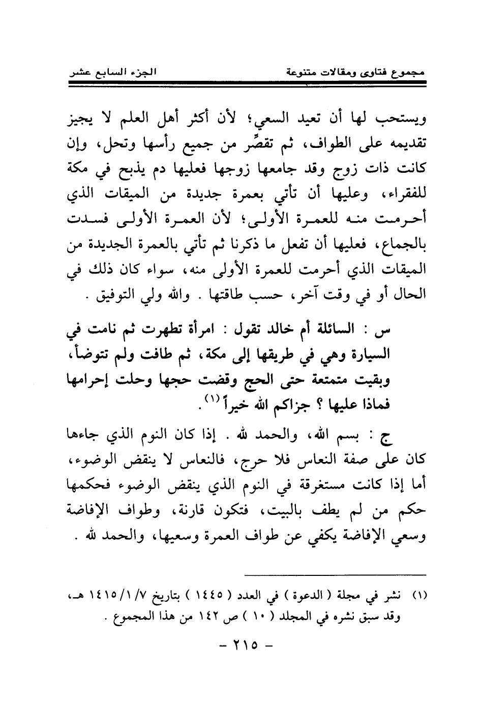 ج: بسم الله، والحمد لله. إذا كان النوم الذي جاءها كان على صفة النعاس فلا حرج، فالنعاس لا ينقض الوضوء، أما إذا كانت مستغرقة في النوم الذي ينقض الوضوء فحكمها حكم من لم يطف بالبيت، فتكون قارنة، وطواف الإفاضة وسعي الإفاضة يكفي عن طواف العمرة وسعيها، والحمد لله.