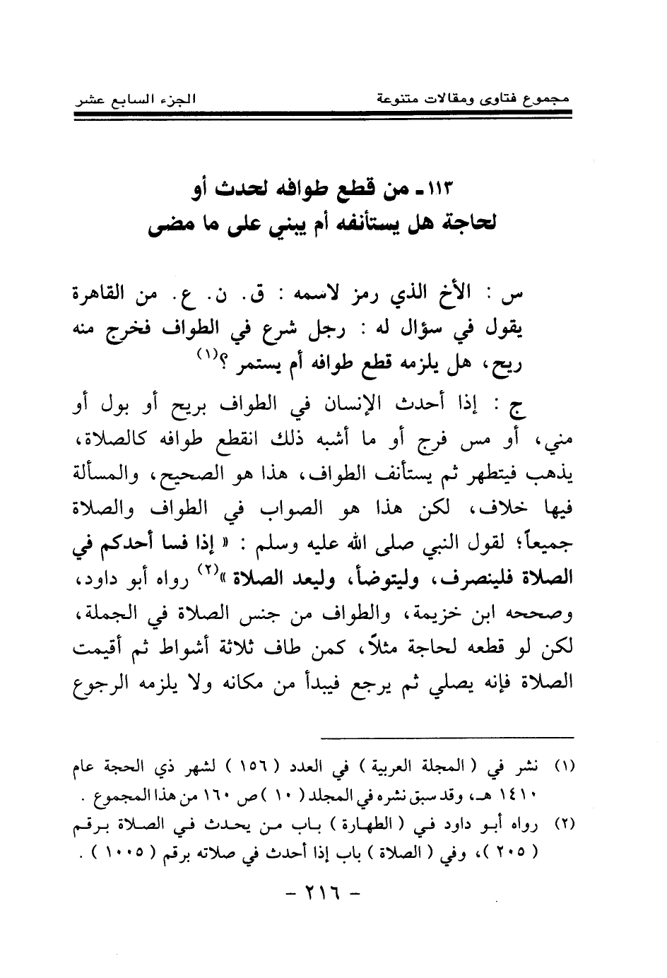 ج: إذا أحدث الإنسان في الطواف بريح أو بول أو مني، أو مس فرج أو ما أشبه ذلك انقطع طوافه كالصلاة، يذهب فيتطهر ثم يستأنف الطواف، هذا هو الصحيح، والمسألة فيها خلاف، لكن هذا هو الصواب في الطواف والصلاة جميعا؛ لقول النبي صلى الله عليه وسلم: «إذا فسا أحدكم في الصلاة فلينصرف، وليتوضأ، وليعد الصلاة (¬1) » رواه أبو داود، وصححه ابن خزيمة، والطواف من جنس الصلاة في الجملة، لكن لو قطعه لحاجة مثلا، كمن طاف ثلاثة أشواط ثم أقيمت الصلاة فإنه يصلي ثم يرجع فيبدأ من مكانه ولا يلزمه الرجوع