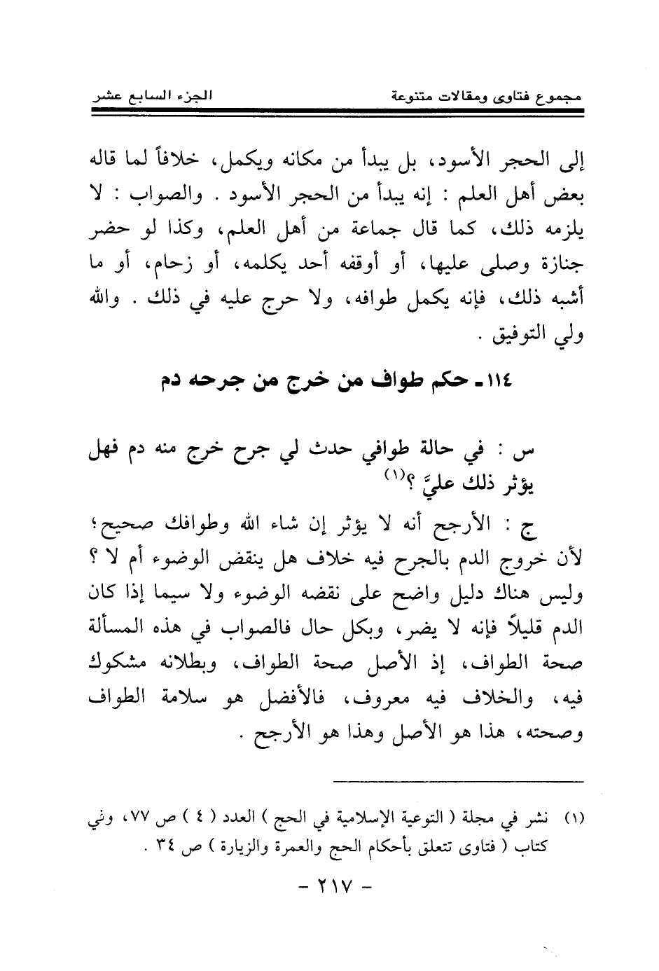 إلى الحجر الأسود، بل يبدأ من مكانه ويكمل، خلافا لما قاله بعض أهل العلم: إنه يبدأ من الحجر الأسود. والصواب: لا يلزمه ذلك، كما قال جماعة من أهل العلم، وكذا لو حضر جنازة وصلى عليها، أو أوقفه أحد يكلمه، أو زحام، أو ما أشبه ذلك، فإنه يكمل طوافه، ولا حرج عليه في ذلك. والله ولي التوفيق.