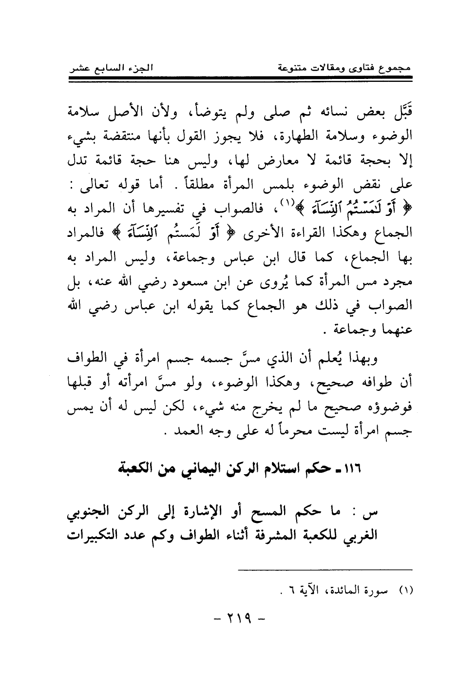 قبل بعض نسائه ثم صلى ولم يتوضأ، ولأن الأصل سلامة الوضوء وسلامة الطهارة، فلا يجوز القول بأنها منتقضة بشيء إلا بحجة قائمة لا معارض لها، وليس هنا حجة قائمة تدل على نقض الوضوء بلمس المرأة مطلقا. أما قوله تعالى: {أَوْ لَامَسْتُمُ النِّسَاءَ} (¬1) فالصواب في تفسيرها أن المراد به الجماع وهكذا القراءة الأخرى أو لامستم النساء فالمراد بها الجماع، كما قال ابن عباس وجماعة، وليس المراد به مجرد مس المرأة كما يروى عن ابن مسعود رضي الله عنه، بل الصواب في ذلك هو الجماع كما يقوله ابن عباس رضي الله عنهما وجماعة.