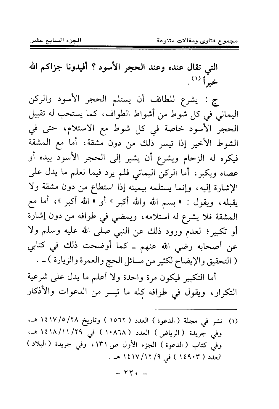 ج: يشرع للطائف أن يستلم الحجر الأسود والركن اليماني في كل شوط من أشواط الطواف، كما يستحب له تقبيل الحجر الأسود خاصة في كل شوط مع الاستلام، حتى في الشوط الأخير إذا تيسر ذلك من دون مشقة، أما مع المشقة فيكره له الزحام ويشرع أن يشير إلى الحجر الأسود بيده أو عصاه ويكبر، أما الركن اليماني فلم يرد فيما نعلم ما يدل على الإشارة إليه، وإنما يستلمه بيمينه إذا استطاع من دون مشقة ولا يقبله، ويقول: " بسم الله والله أكبر " أو " الله أكبر "، أما مع المشقة فلا يشرع له استلامه، ويمضي في طوافه من دون إشارة أو تكبيرة لعدم ورود ذلك عن النبي صلى الله عليه وسلم ولا عن أصحابه رضي الله عنهم - كما أوضحت ذلك في كتابي (التحقيق والإيضاح لكثير من مسائل الحج والعمرة والزيارة) .
