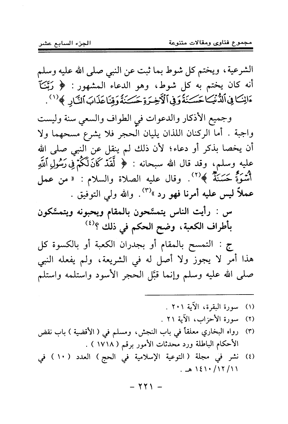 س: رأيت الناس يتمسحون بالمقام ويحبونه ويتمسكون بأطراف الكعبة، وضح الحكم في ذلك؟ (¬1) .