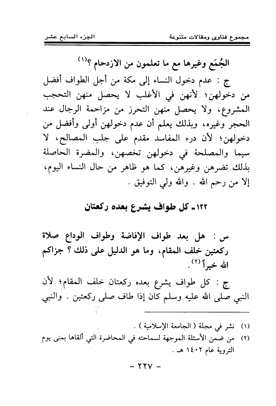 ج: عدم دخول النساء إلى مكة من أجل الطواف أفضل من دخولهن؛ لأنهن في الأغلب لا يحصل منهن التحجب المشروع، ولا يحصل منهن التحرز من مزاحمة الرجال عند الحجر وغيره، وبذلك يعلم أن عدم دخولهن أولى وأفضل من دخولهن؛ لأن درء المفاسد مقدم على جلب المصالح، لا سيما والمصلحة في دخولهن تخصهن، والمضرة الحاصلة بذلك تضرهن وغيرهن، كما هو ظاهر من حال النساء اليوم، إلا من رحم الله. والله ولي التوفيق.