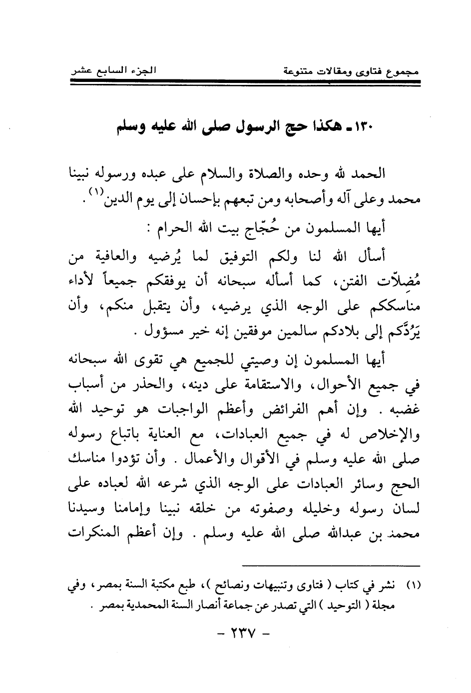 أيها المسلمون إن وصيتي للجميع هي تقوى الله سبحانه في جميع الأحوال، والاستقامة على دينه، والحذر من أسباب غضبه، وإن أهم الفرائض وأعظم الواجبات هو توحيد الله والإخلاص له في جميع العبادات، مع العناية باتباع رسوله صلى الله عليه وسلم في الأقوال والأعمال. وأن تؤدوا مناسك الحج وسائر العبادات على الوجه الذي شرعه الله لعباده على لسان رسوله وخليله وصفوته من خلقه نبينا وإمامنا وسيدنا محمد بن عبد الله صلى الله عليه وسلم. وإن أعظم المنكرات