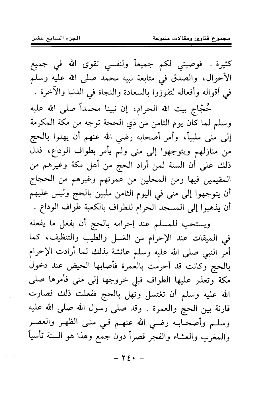 ويستحب للمسلم عند إحرامه بالحج أن يفعل ما يفعله في الميقات عند الإحرام من الغسل والطيب والتنظيف، كما أمر النبي صلى الله عليه وسلم عائشة بذلك لما أرادت الإحرام بالحج، وكانت قد أحرمت بالعمرة فأصابها الحيض عند دخول مكة وتعذر عليها الطواف قبل خروجها إلى منى، فأمرها صلى الله عليه وسلم أن تغتسل وتهل بالحج ففعلت ذلك فصارت قارنة بين الحج والعمرة. وقد «صلى رسول الله صلى الله عليه وسلم وأصحابه رضي الله عنهم في منى الظهر والعصر والمغرب والعشاء والفجر قصرا دون جمع (¬1) » ، وهذا هو السنة تأسيا