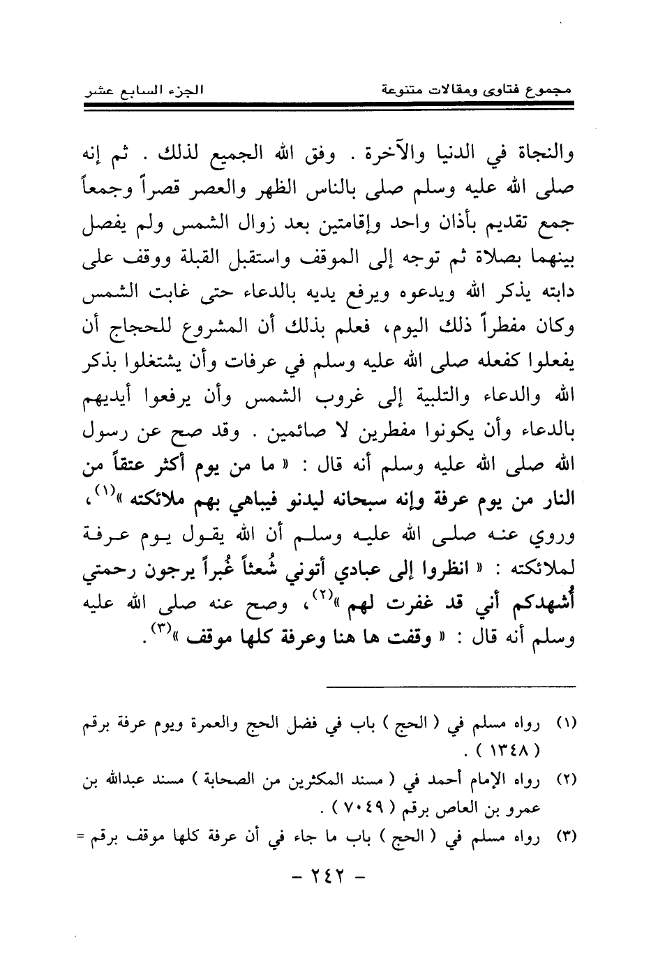 والنجاة في الدنيا والآخرة. وفق الله الجميع لذلك. ثم إنه صلى الله عليه وسلم صلى بالناس الظهر والعصر قصرا وجمعا جمع تقديم بأذان واحد وإقامتين بعد زوال الشمس، ولم يفصل بينهما بصلاة، ثم توجه إلى الموقف واستقبل القبلة ووقف على دابته يذكر الله ويدعوه ويرفع يديه بالدعاء حتى غابت الشمس، وكان مفطرا ذلك اليوم، فعلم بذلك أن المشروع للحجاج أن يفعلوا كفعله صلى الله عليه وسلم في عرفات، وأن يشتغلوا بذكر الله والدعاء والتلبية إلى غروب الشمس، وأن يرفعوا أيديهم بالدعاء وأن يكونوا مفطرين لا صائمين.