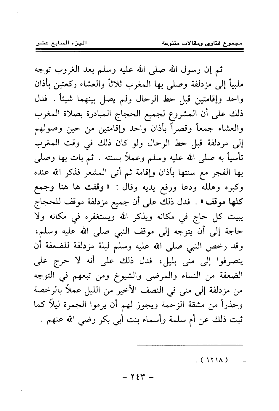 ثم إن رسول الله صلى الله عليه وسلم بعد الغروب توجه ملبيا إلى مزدلفة وصلى بها المغرب ثلاثا والعشاء ركعتين بأذان واحد وإقامتين قبل حط الرحال، ولم يصل بينهما شيئا. فدل ذلك على أن المشروع لجميع الحجاج المبادرة بصلاة المغرب والعشاء جمعا وقصرا بأذان واحد وإقامتين من حين وصولهم إلى مزدلفة قبل حط الرحال، ولو كان ذلك في وقت المغرب؛ تأسيا به صلى الله عليه وسلم وعملا بسنته، ثم بات بها وصلى بها الفجر مع سنتها بأذان وإقامة، ثم أتى المشعر فذكر الله عنده وكبره وهلله ودعا ورفع يديه وقال: «وقفت هاهنا وجمع كلها موقف (¬1) » .