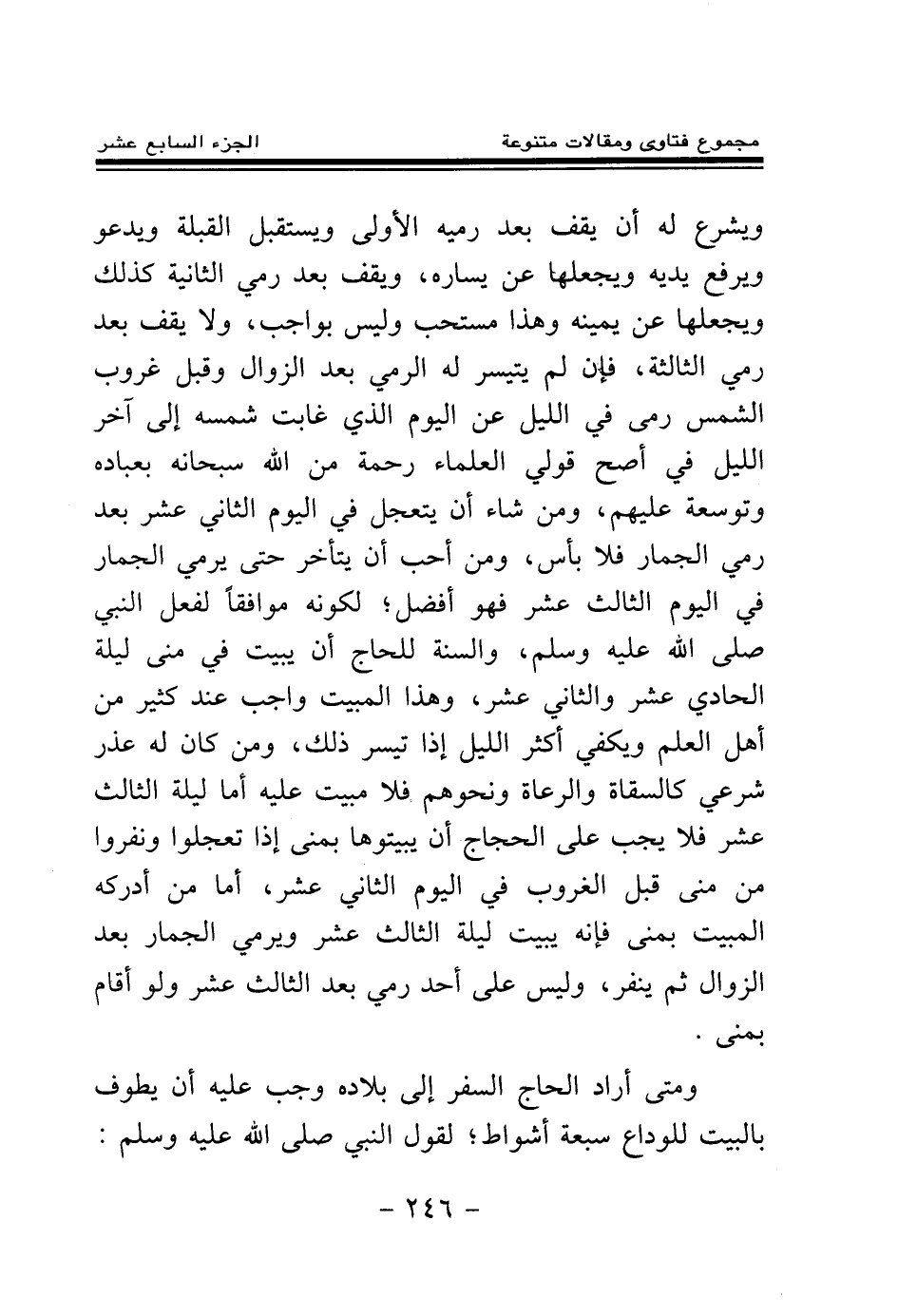 ويشرع له أن يقف بعد رميه الأولى ويستقبل القبلة ويدعو ويرفع يديه ويجعلها عن يساره، ويقف بعد رمي الثانية كذلك ويجعلها عن يمينه، وهذا مستحب وليس بواجب، ولا يقف بعد رمي الثالثة، فإن لم يتيسر له الرمي بعد الزوال وقبل غروب الشمس رمى في الليل عن اليوم الذي غابت شمسه إلى آخر الليل في أصح قولي العلماء رحمة من الله سبحانه بعباده وتوسعة عليهم، ومن شاء أن يتعجل في اليوم الثاني عشر بعد رمي الجمار فلا بأس، ومن أحب أن يتأخر حتى يرمي الجمار في اليوم الثالث عشر فهو أفضل؛ لكونه موافقا لفعل النبي صلى الله عليه وسلم، والسنة للحاج أن يبيت في منى ليلة الحادي عشر والثاني عشر، وهذا المبيت واجب عند كثير من أهل العلم ويكفي أكثر الليل إذا تيسر ذلك، ومن كان له عذر شرعي كالسقاة والرعاة ونحوهم فلا مبيت عليه، أما ليلة الثالث عشر فلا يجب على الحجاج أن يبيتوها بمنى إذا تعجلوا ونفروا من منى قبل الغروب في اليوم الثاني عشر، أما من أدركه المبيت بمنى فإنه يبيت ليلة الثالث عشر ويرمي الجمار بعد الزوال ثم ينفر، وليس على أحد رمي بعد الثالث عشر ولو أقام بمنى.