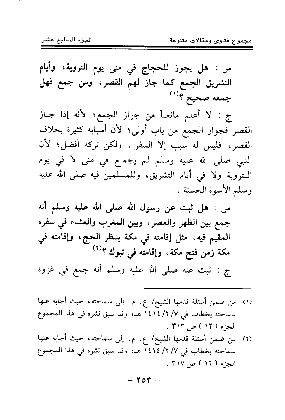 ج: لا أعلم مانعا من جواز الجمع؛ لأنه إذا جاز القصر فجواز الجمع من باب أولى؛ لأن أسبابه كثيرة بخلاف القصر، فليس له سبب إلا السفر. ولكن تركه أفضل؛ لأن النبي صلى الله عليه وسلم لم يجمع في منى لا في يوم التروية ولا في أيام التشريق، وللمسلمين فيه صلى الله عليه وسلم الأسوة الحسنة.
