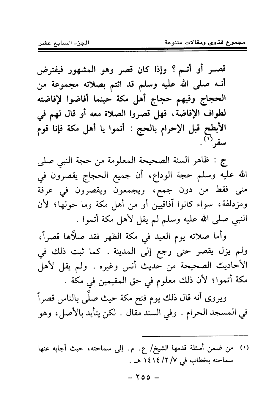 قصر أو أتم؟ وإذا كان قصر وهو المشهور فيفترض أنه صلى الله عليه وسلم قد ائتم بصلاته مجموعة من الحجاج، وفيهم حجاج أهل مكة حينما أفاضوا لإفاضته لطواف الإفاضة، فهل قصروا الصلاة معه أو قال لهم في الأبطح قبل الإحرام بالحج: أتموا يا أهل مكة فإنا قوم سفر (¬1) .
